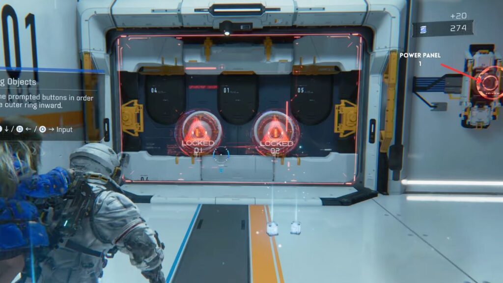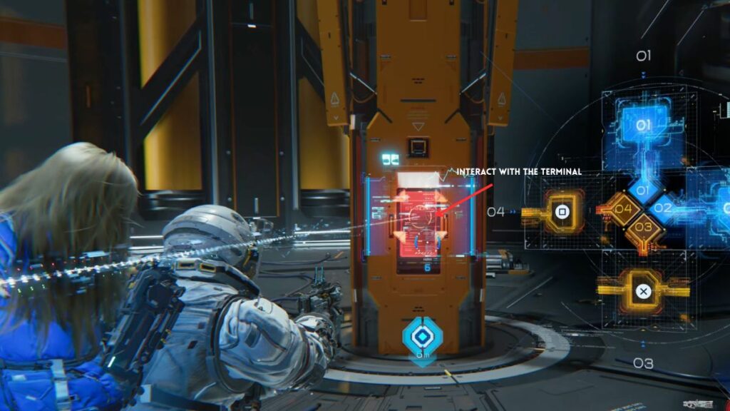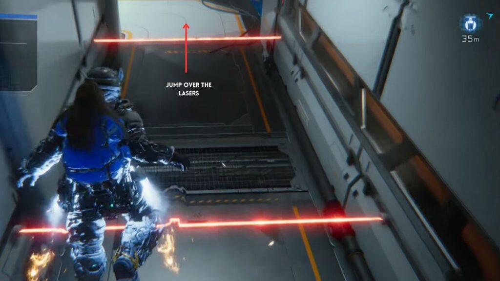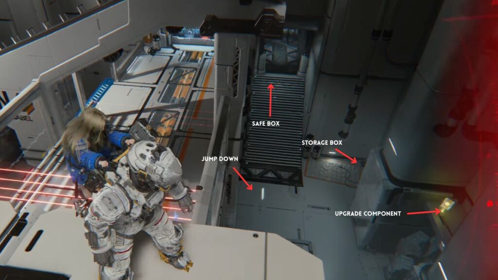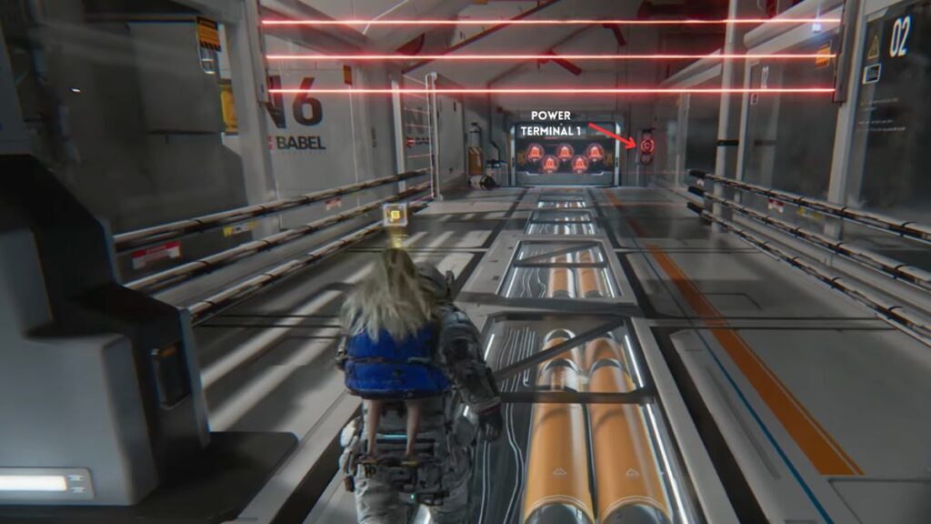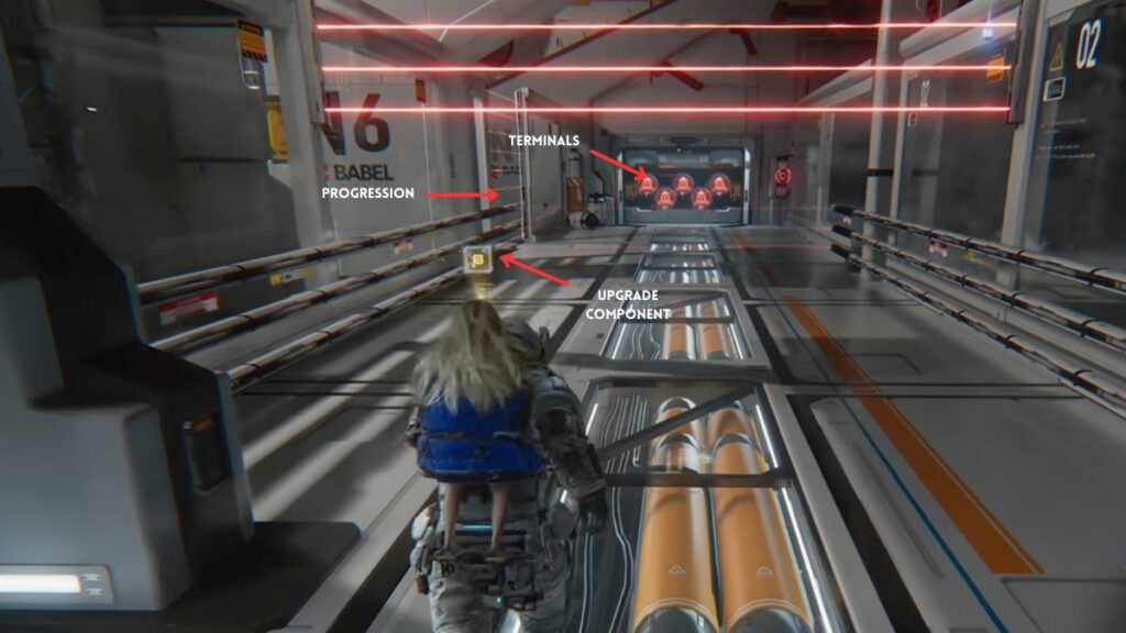 Walk down the stairs where you’ll find lasers and an Upgrade Component in your path. Grab the component and dodge past the lasers. At the end of this stretch, five power terminals are waiting to be unlocked.