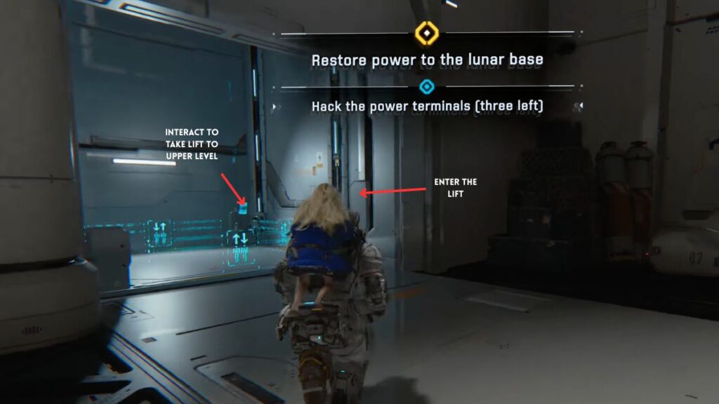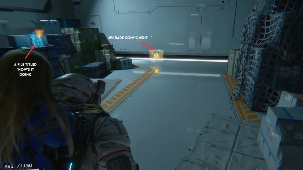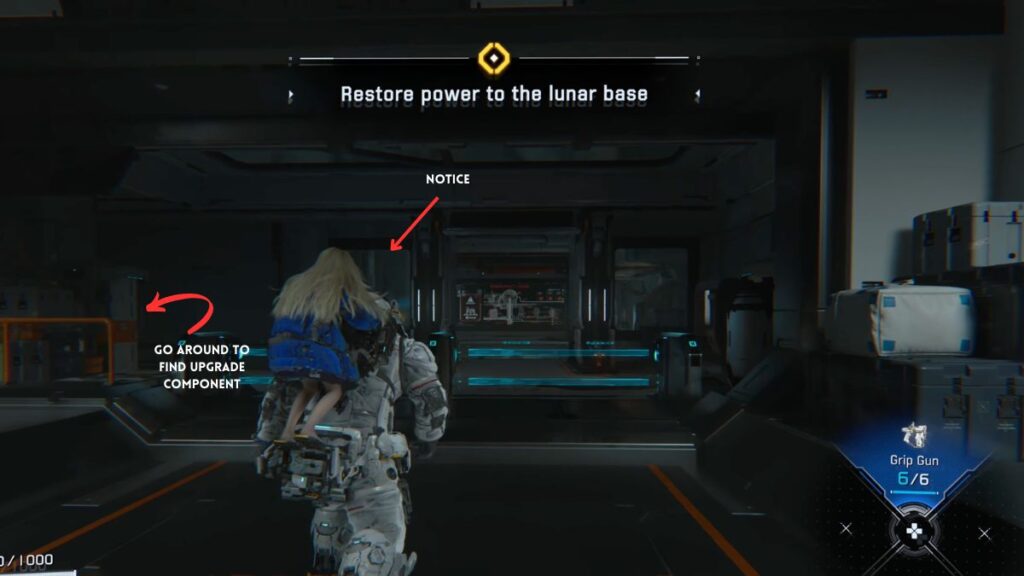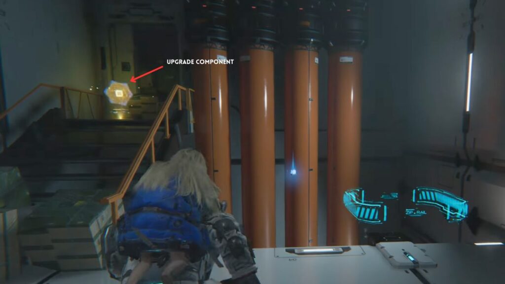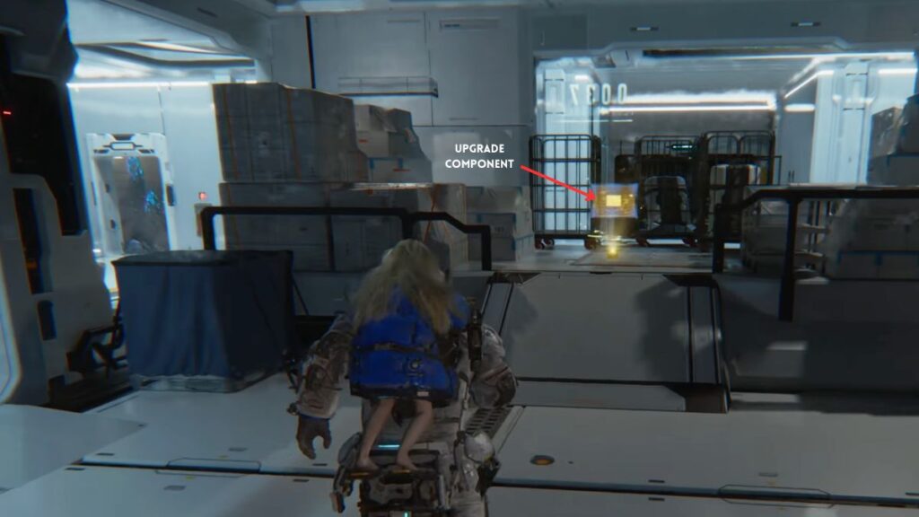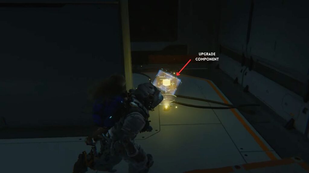 After entering the area, you’ll be prompted to restore power to the lunar base. Move forward past the blue barriers and look to the left to find a screen — interact with it to read a warning message that reads “WARNING: Severe Tremor Detected.” Take the left turn from here and move around the boxes to find your first Upgrade Components. These are used to upgrade Hugh’s abilities and Diana’s hacking at the Shelter, improving stats like damage and health.