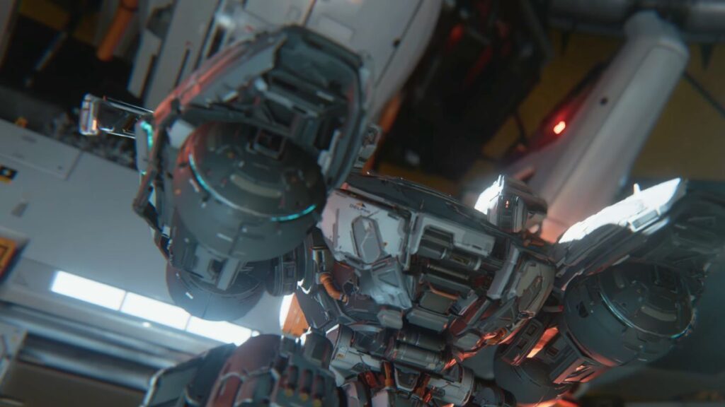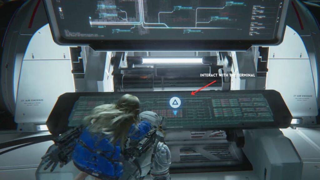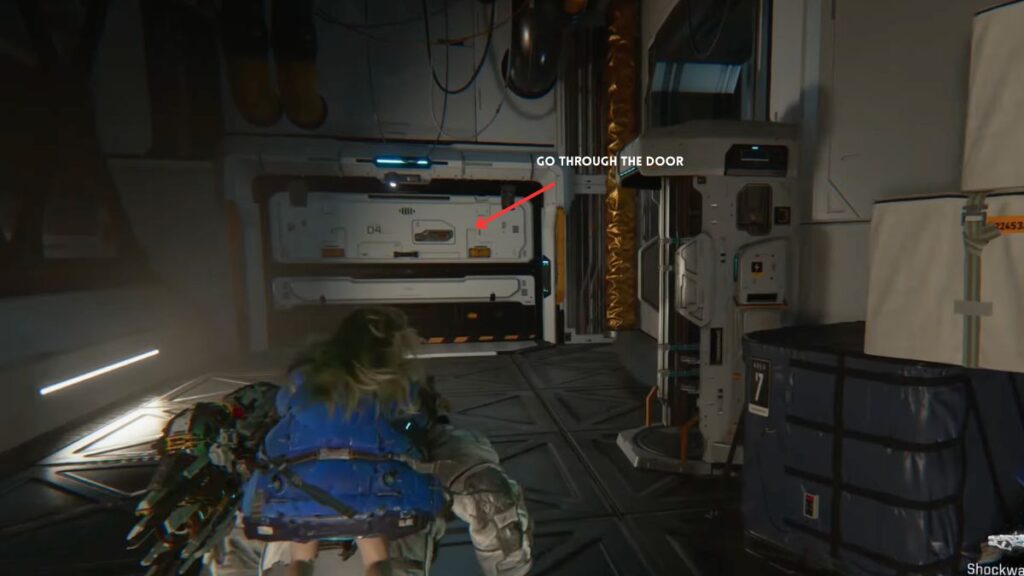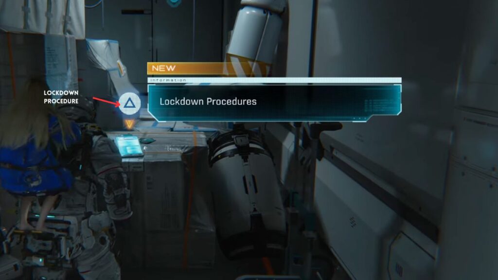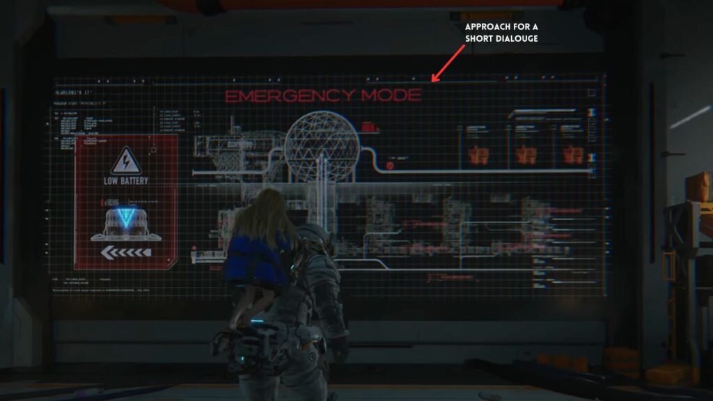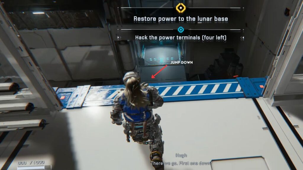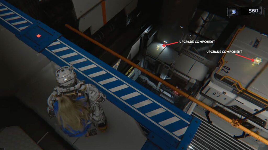 After entering the area, you’ll be prompted to restore power to the lunar base. Move forward past the blue barriers and look to the left to find a screen — interact with it to read a warning message that reads “WARNING: Severe Tremor Detected.” Take the left turn from here and move around the boxes to find your first Upgrade Components. These are used to upgrade Hugh’s abilities and Diana’s hacking at the Shelter, improving stats like damage and health.
