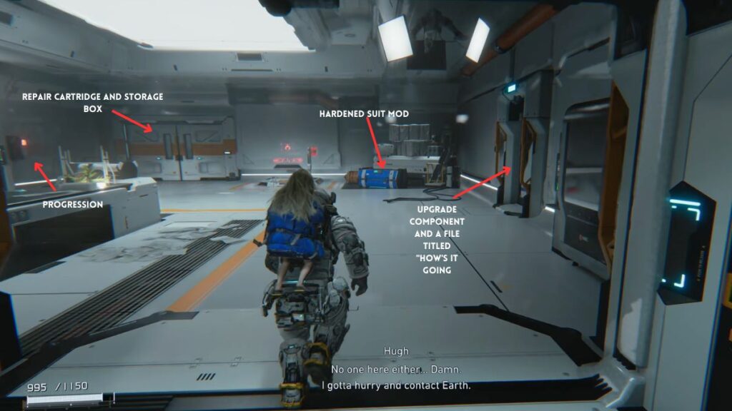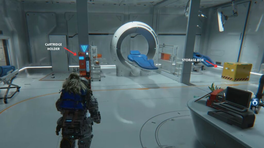 As soon as you enter, you’ll see a blue crate directly ahead. Open it to collect the Hardened Suit Mod, which increases your max HP by 10%. On the left side of the room, go through the door to find the Cartridge Holder. Activate the orange device near the gurney to collect a Repair Cartridge — at this point in the game you should have two cartridges total. There’s also a Storage Box in the corner and a hologram projector on the desk in this room.