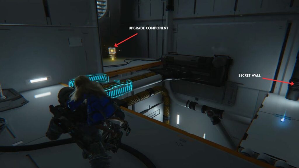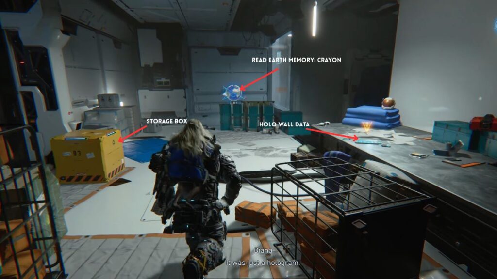 Use the hand lift on the left wall to reach the upper floor. Grab the Upgrade Component in the alcove up here, then look across to find a fake secret wall. Get close and interact to enter the hidden room. Inside, check the right side for Holo Wall Data and the opposite side for a Storage Box. At the far end of the room, collect the Read Earth Memory: Crayon.
