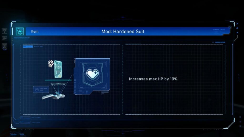 | Mods | Hardened Suit | Blue crate at the entrance of the Concourse, increases max HP by 10% |