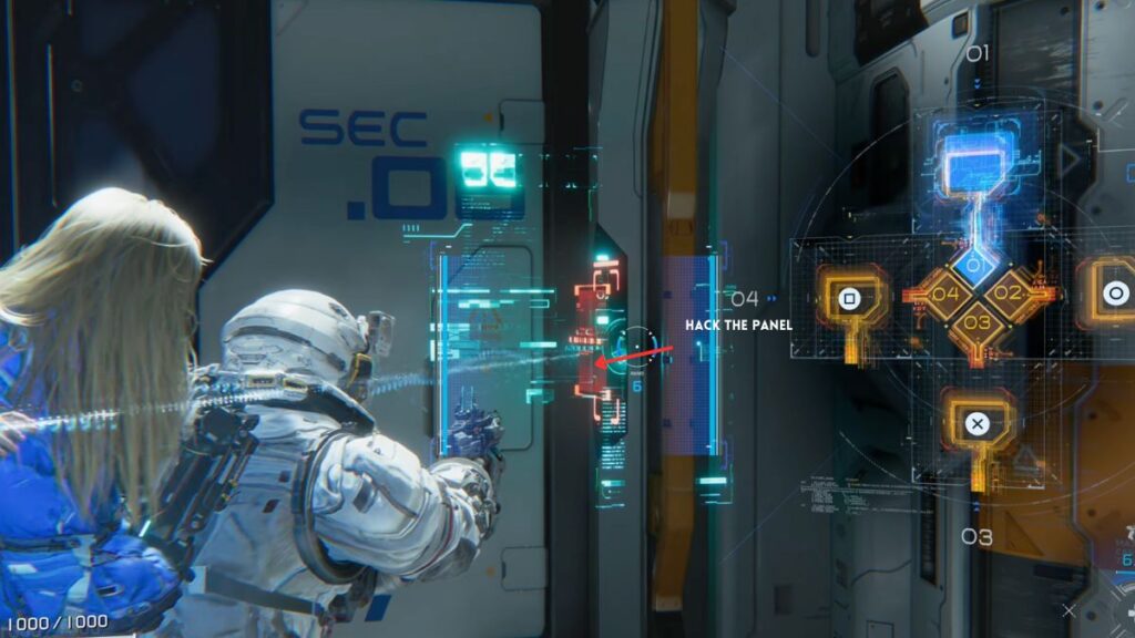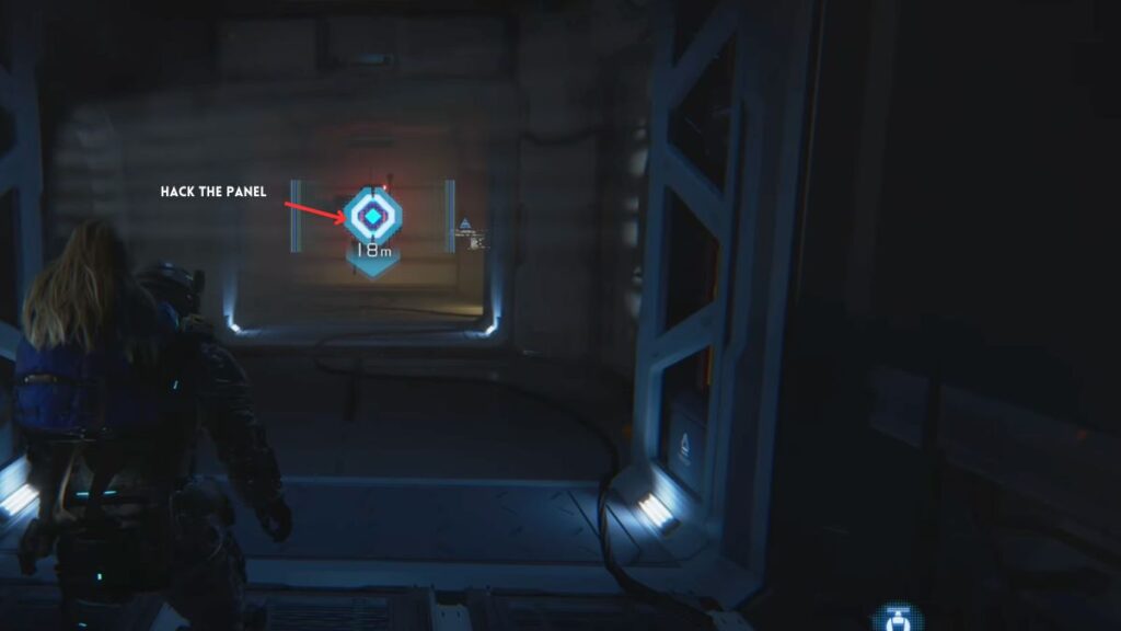On the right path, you’ll spot a room with a blocked entrance that you can’t access just yet. Keep it in mind and continue straight into the hallway, where a flying drone called a Watcher will come at you. Destroy it. Ahead is a door sealed by two locks. You’ll need to hack two power terminals to open it. One is on the right side of the doors, and the other is inside the room on the left. Before heading to the hallway, turn around to pick up another Upgrade Component.