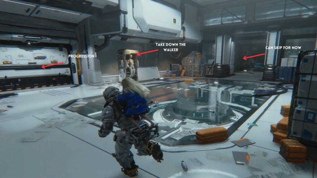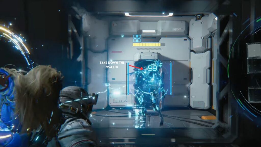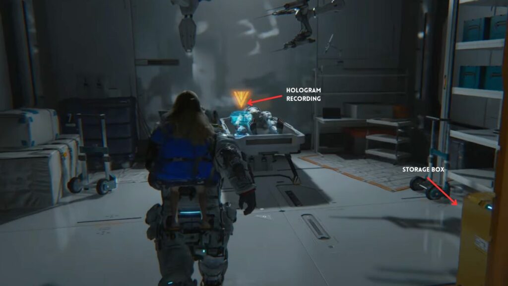 Take a right into an open room. A Walker will activate as you enter, and defeat it to remove the barrier from the exit door. Before leaving, you must have noticed a door when you entered this large area, and in the far right corner of the room. Hack the panel to get inside. Activate the item on the hospital bed to trigger a hologram recording. Check the corner near the door to find a Storage Box.