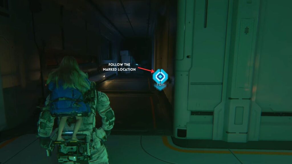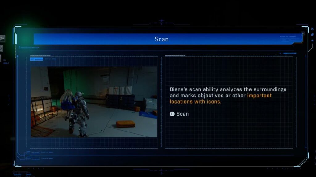 Go through the door into a larger area. As you approach a digital screen ahead, a short dialogue will play between Hugh and Diana. Keep following the linear path and when you get close to the green-lit area, the game will introduce Diana’s Scan ability.
