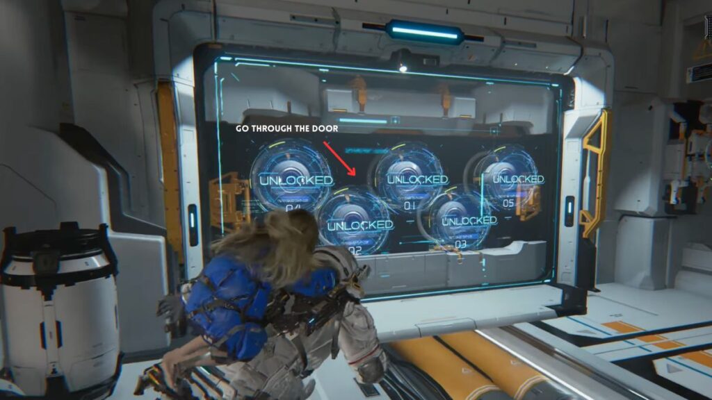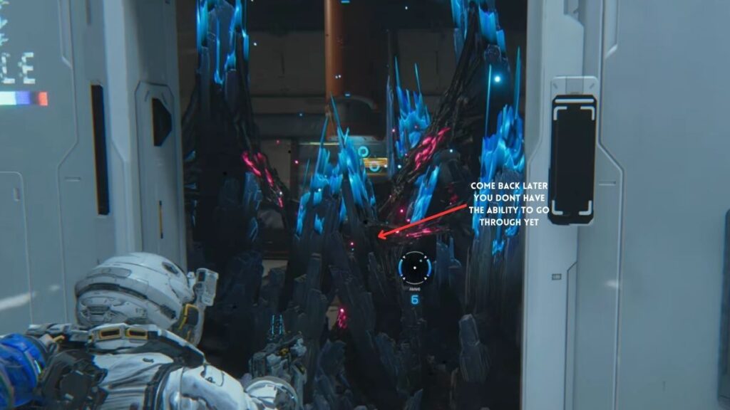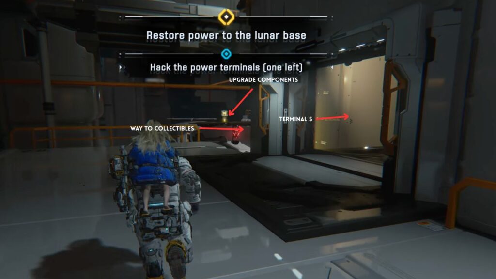 You’ll now be prompted to proceed through the unlocked door. Exit through the opposite door from where you entered, and on the right side collect one more Upgrade Component before heading back to the main door with the five terminals and walking through.