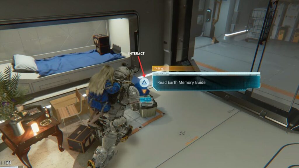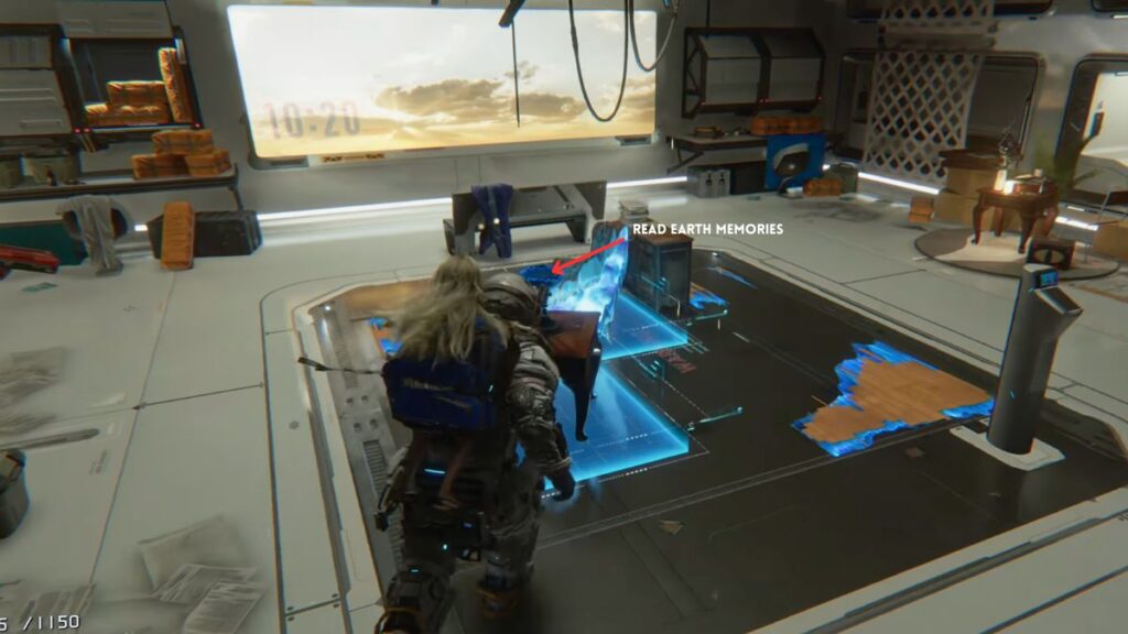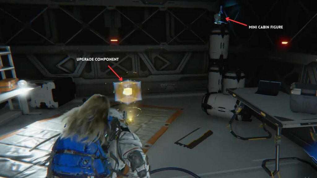 Once inside, pick up the Upgrade Component on the left. Jump down and keep walking until a cutscene introduces Read Earth Memories, recordings that can be played back at the Shelter. Before leaving the room, find the tablet on a nearby box and interact with it for more information on Read Earth Memories. Look behind a white mesh to find a bed, and behind it is the second Mini Cabin Figure. Interact with the tablet on the box in front of the blue bedsheet as well.