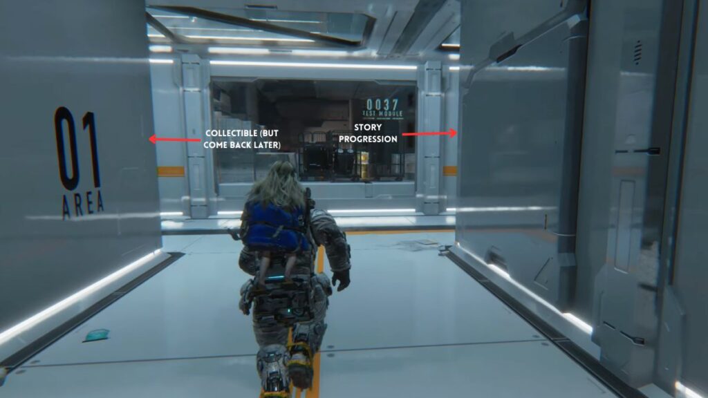 Return to the main room where the path splits in two, one going straight ahead and one going right. Take the left door first. At the T-junction, take a left to reach a dead end — there’s a collectible here but you don’t have what you need yet, so make a mental note and come back later. Take the right path instead.