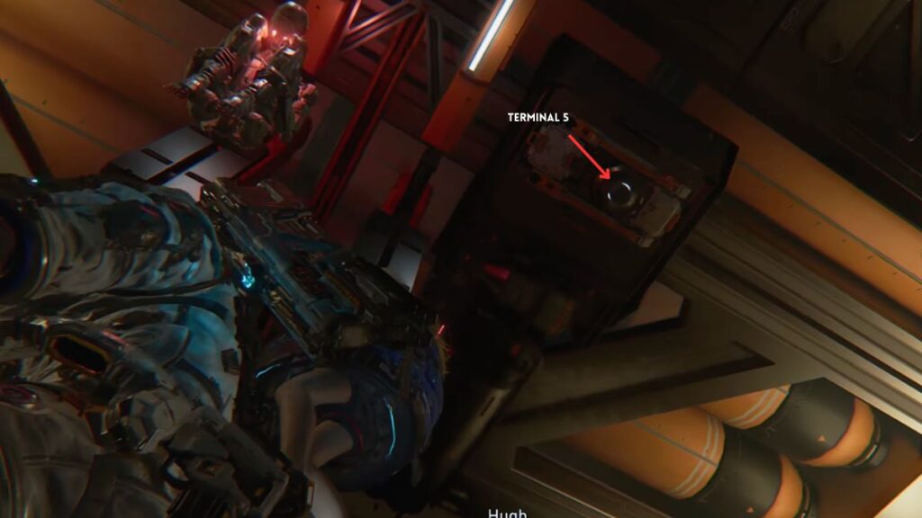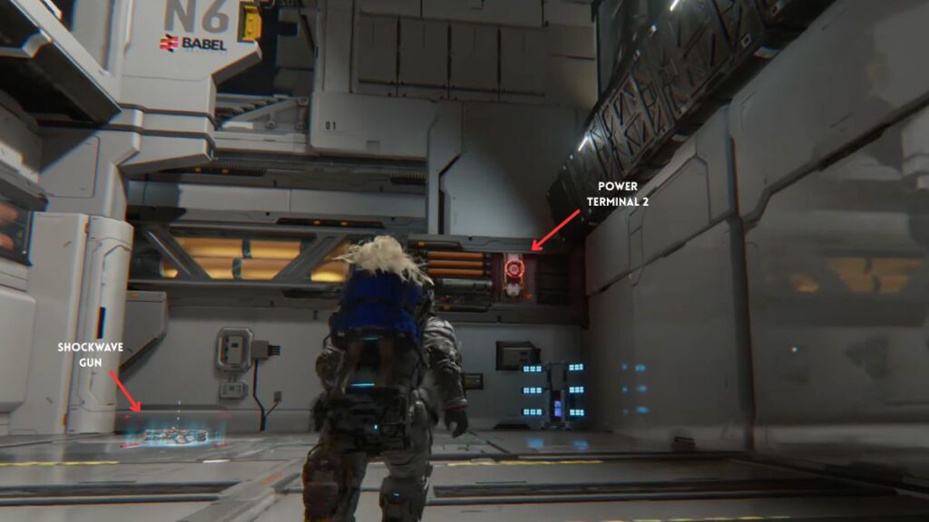 Terminal 5 (3rd in sequence): In the room with the Terminal 4 panel, you will find the yellow door along the wall. To the left of it, you’ll notice an area that resembles the start of the Power Distribution Center. Spot the Upgrade Component on one of the platforms and use your thrusters to reach it. Peek below and you’ll see a group of enemies — drop down and take them out. There’s a Storage Box to the right of the stairs. Climb the stairs into the hallway and find the Safe Box at the end. Head back to the room with the three enemies and hack one of the terminals to reach a higher position where another Upgrade Component is sitting alongside some boxes. With everything collected, head through the yellow door. As soon as you enter, the doors will seal behind you and two enemies will spawn. Defeat them and look up at the ceiling to find the fifth power terminal. Hack it to activate it. After doing so, check the corner of the room to find the first Mini Cabin Figure in the game. Shoot it to claim it.
