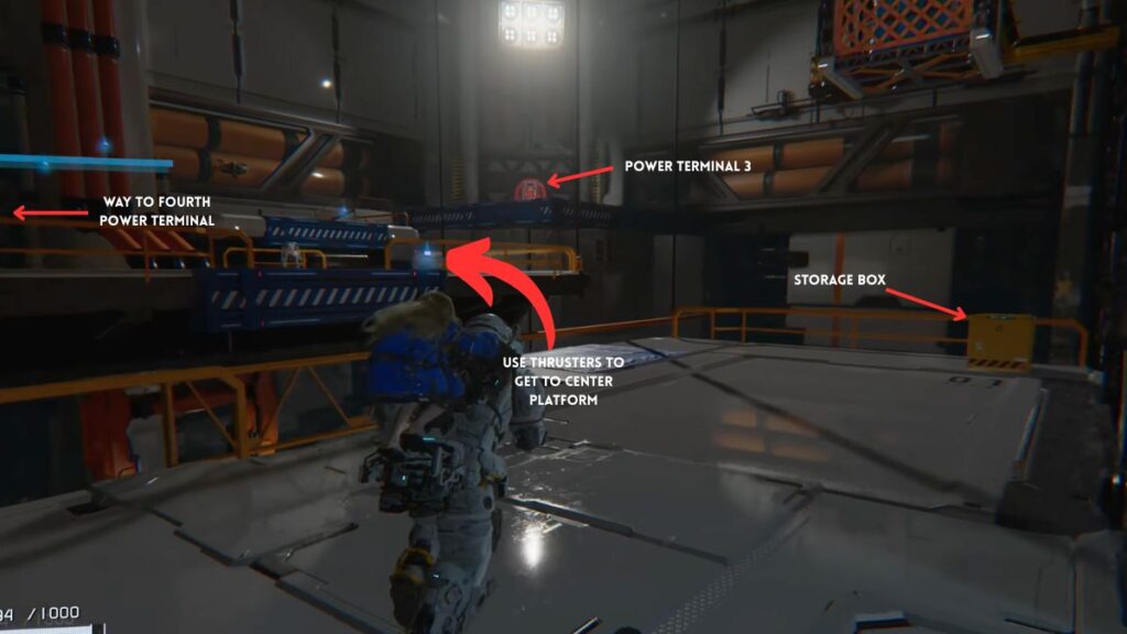 Terminal 3 (2nd in sequence): Back in the main room, step into the lift along the wall and press Triangle to ride it to the upper floor. Use Scan once you’re up there to spot the power terminal and a Storage Box on the right side. Navigate to the center platform using your thrusters, take down the enemies, then jump across the pipes to the right platform to reach and hack the terminal. If you walk to the ledge across from this terminal and look down, you’ll spot two Upgrade Components below. Use the platforms and thrusters to drop down and collect them.