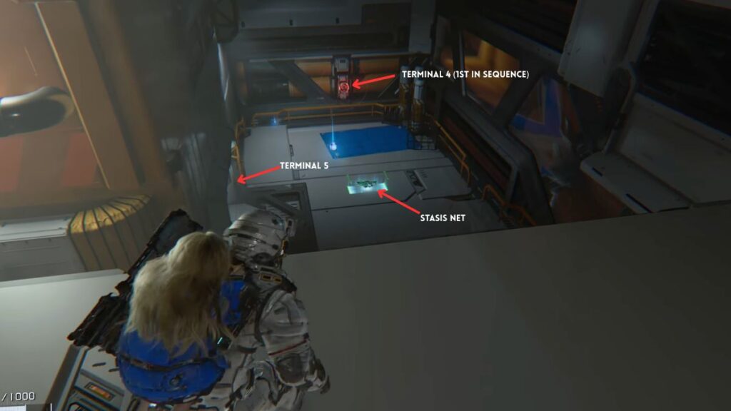 Terminal 4 (1st in sequence): Head back to the lift and this time move toward the left side of the room. Look for a floor drop and use your thrusters to descend. Pick up the Stasis Net weapon on the floor below, then hack the power terminal directly in front of it.