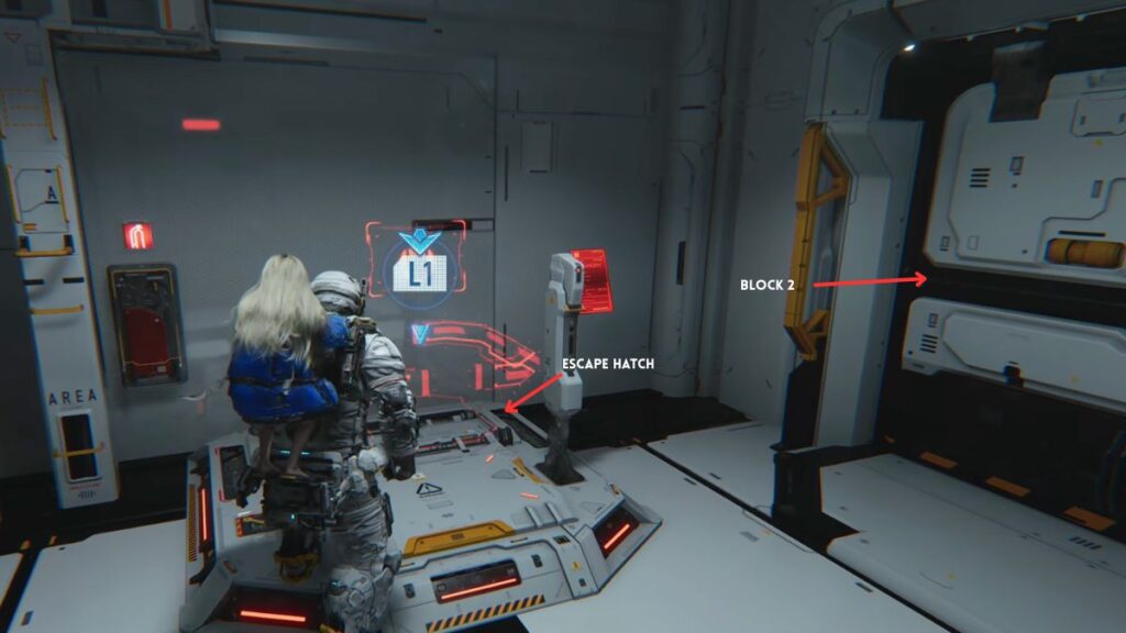 When you’re done, leave the room and take a left. Progress to the next area to activate another Escape Hatch. You’ve now entered the third block.