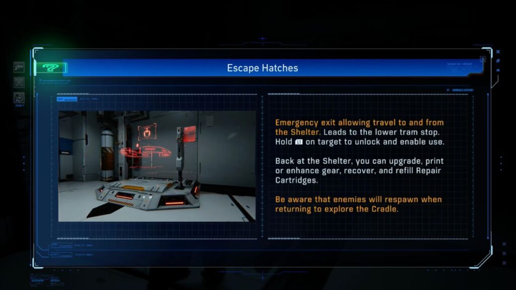 As you enter the next room, you’ll be introduced to the Escape Hatch, an exit that sends you back to the Shelter at any time. Activate it by pressing L1. Go through the door right beside it to enter the second block.
