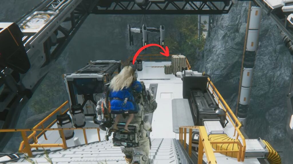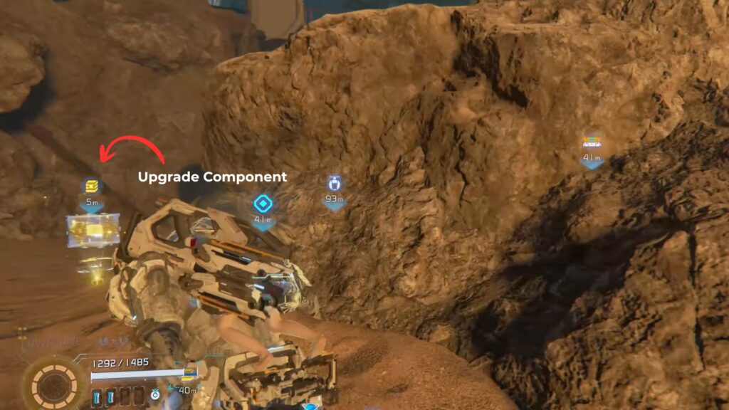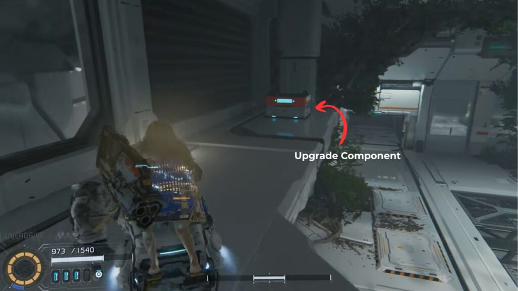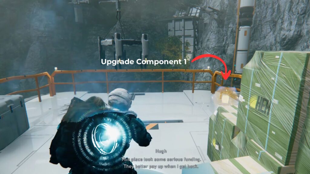 After getting off the tram, go up the ramp and stop at the top. Look right to find a small cluster of items. The Upgrade Component 1 is behind some stacked boxes.