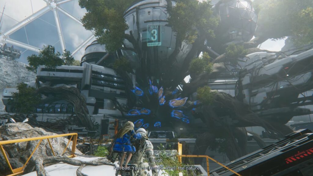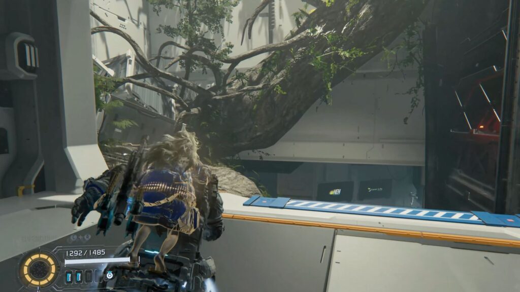 Step off the tram and go through the doorway onto a set of connected walkways. You’ll see the Terra Dome in the distance, covered in overgrown plants. Scan the area to mark a door buried under the vegetation as your next objective, but grab a few collectibles first.