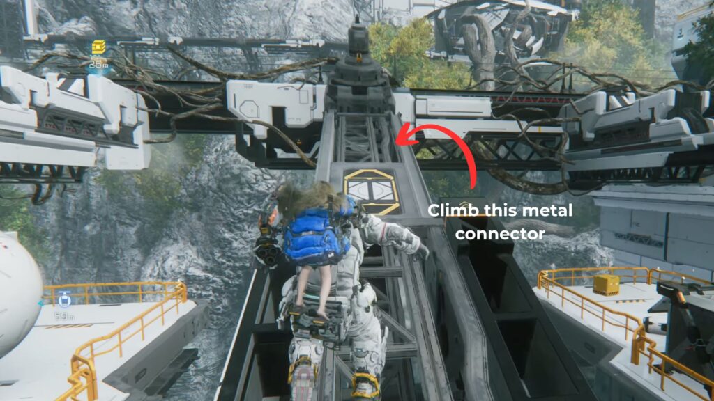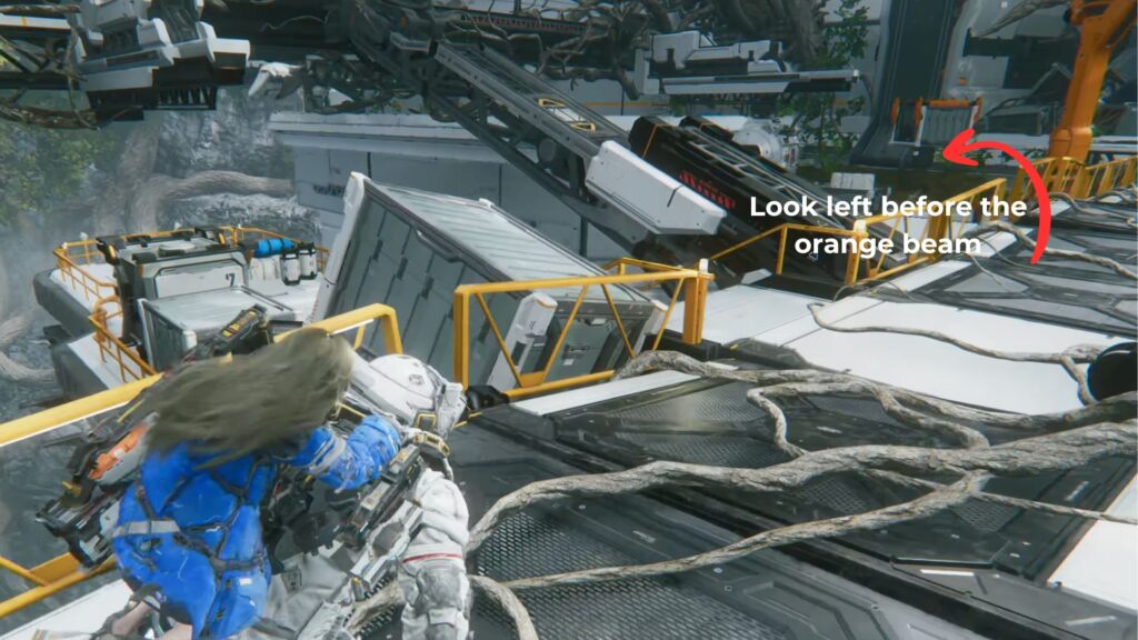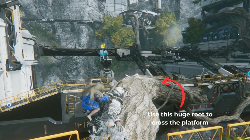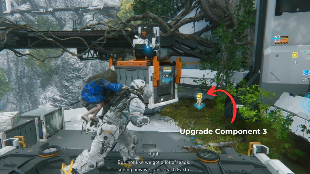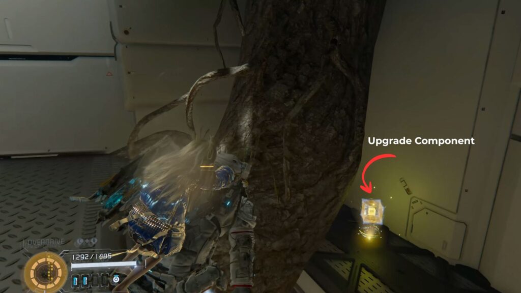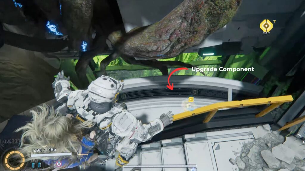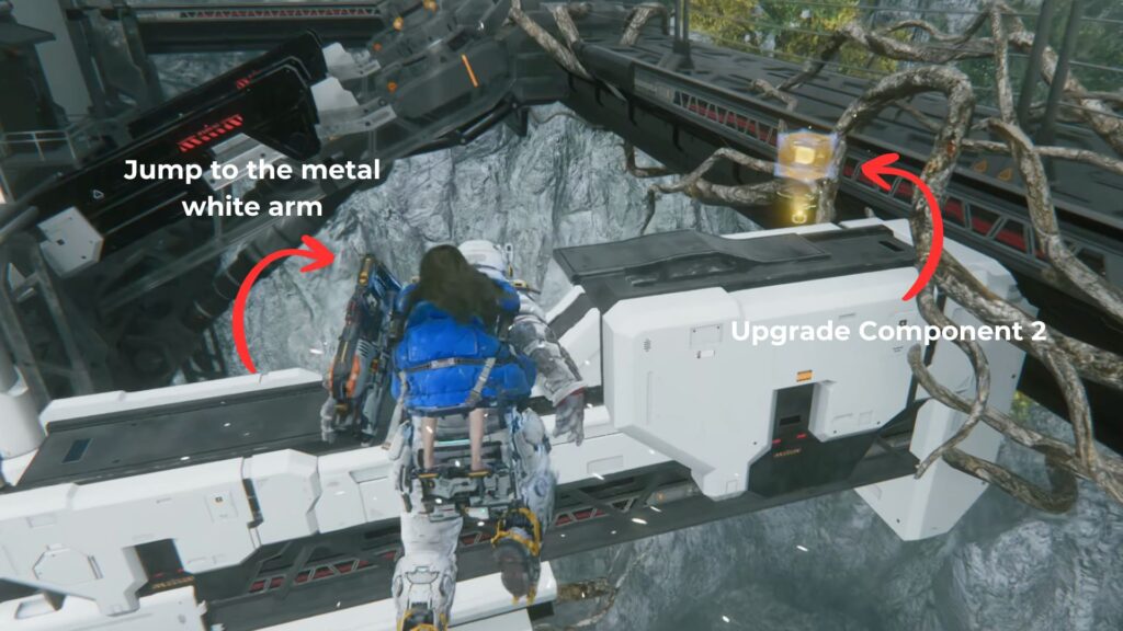 Then, go back up the ramp and look left. You’ll see another Upgrade Component in the distance. Use the large root to cross to the next walkway, then move across the metal connector to the raised section. Jump to the white metal arm holding the component to collect it.