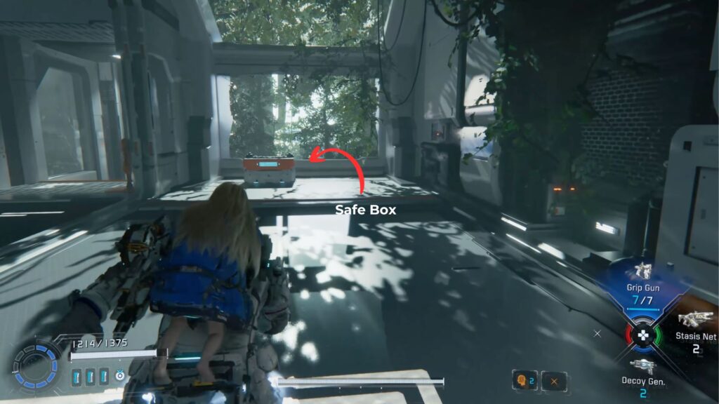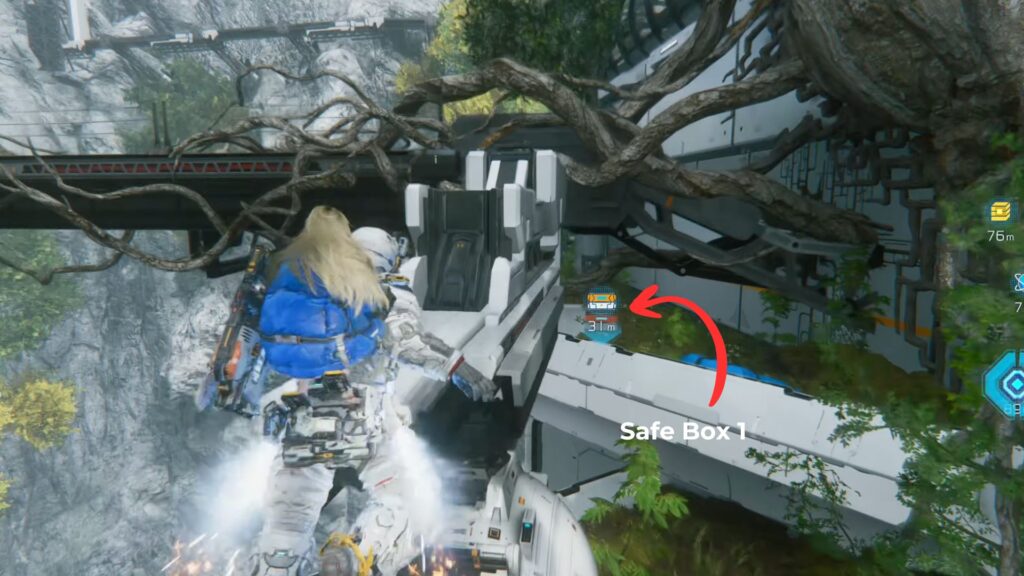 Now, we want to collect the Safe Boxes. Just before the entrance, cross the large root and follow the walkway near the end. Stop at the orange beam and look left, where you will notice a floating crate with a Lunafilament on top.