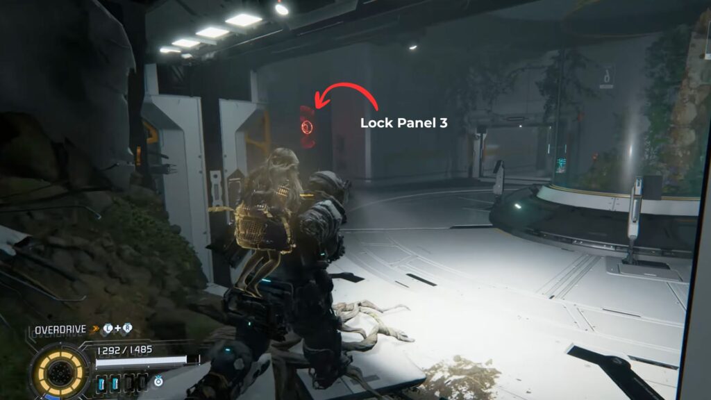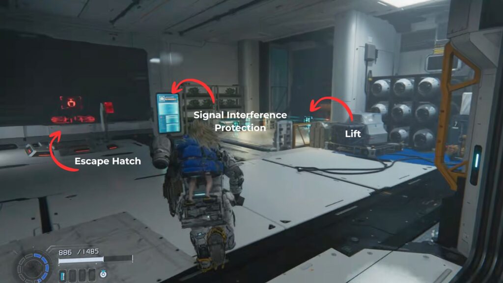 Drop back to the main path and return to the now-unlocked door. Inside you will find an Escape Hatch, a blue panel labeled “Signal Interference Protection,” and a lift. Take it down.