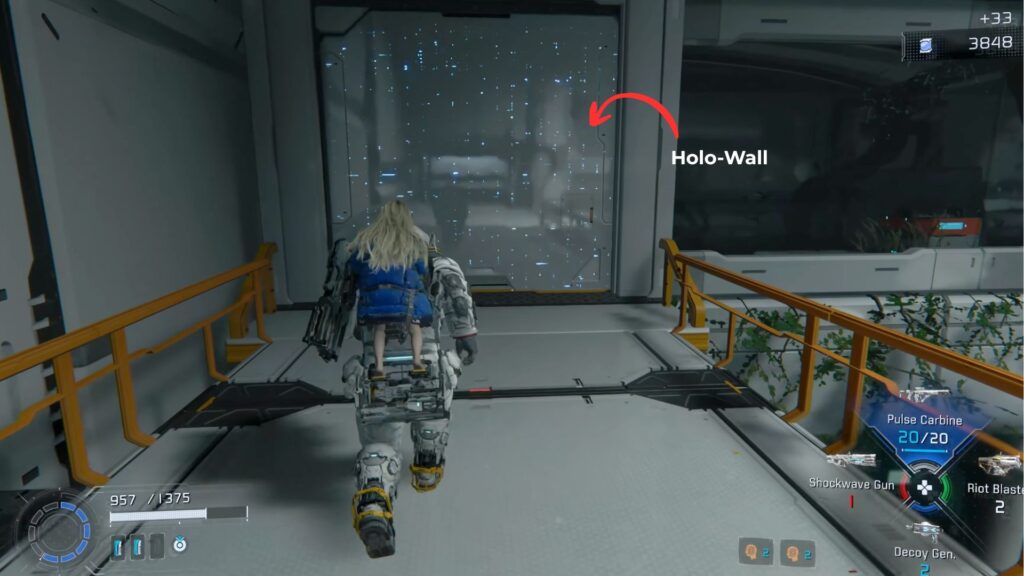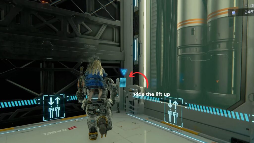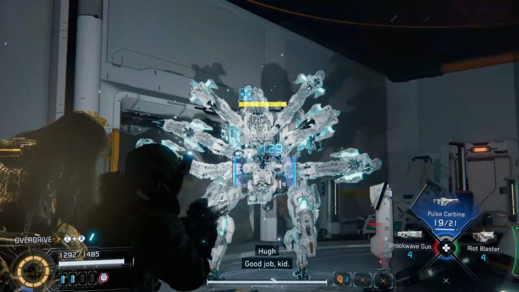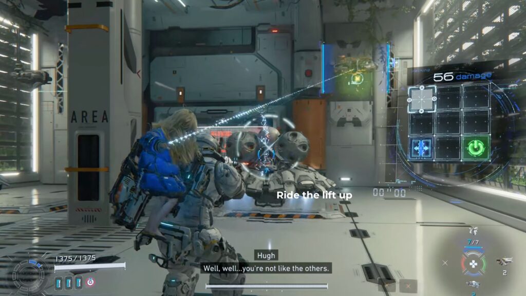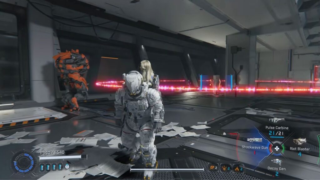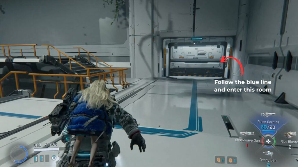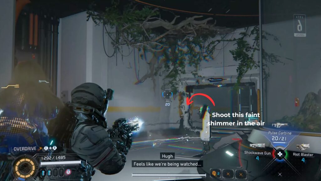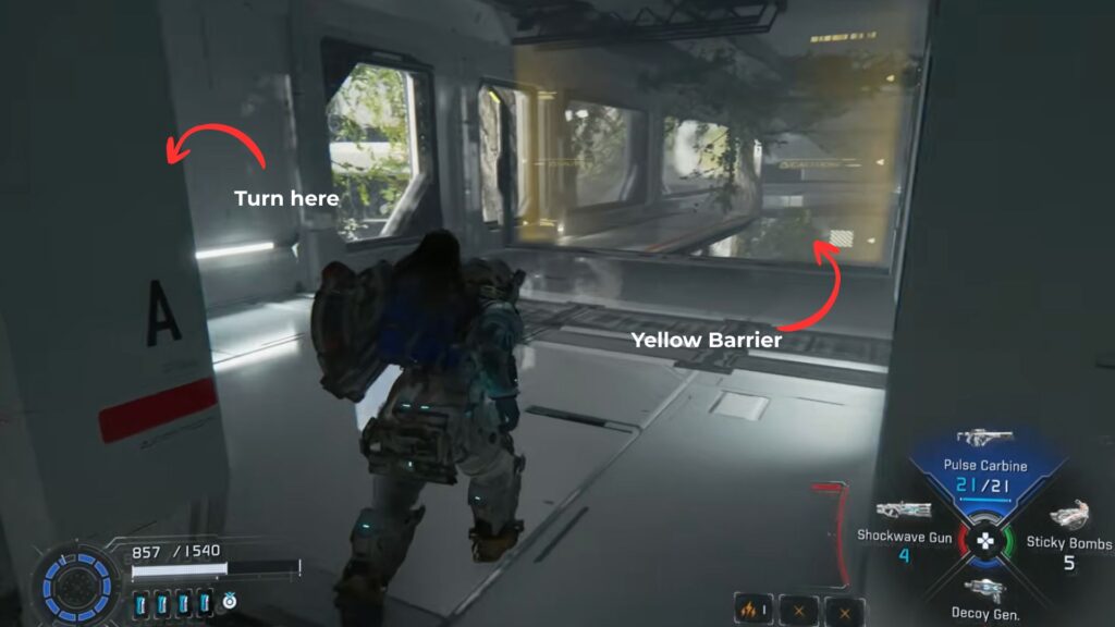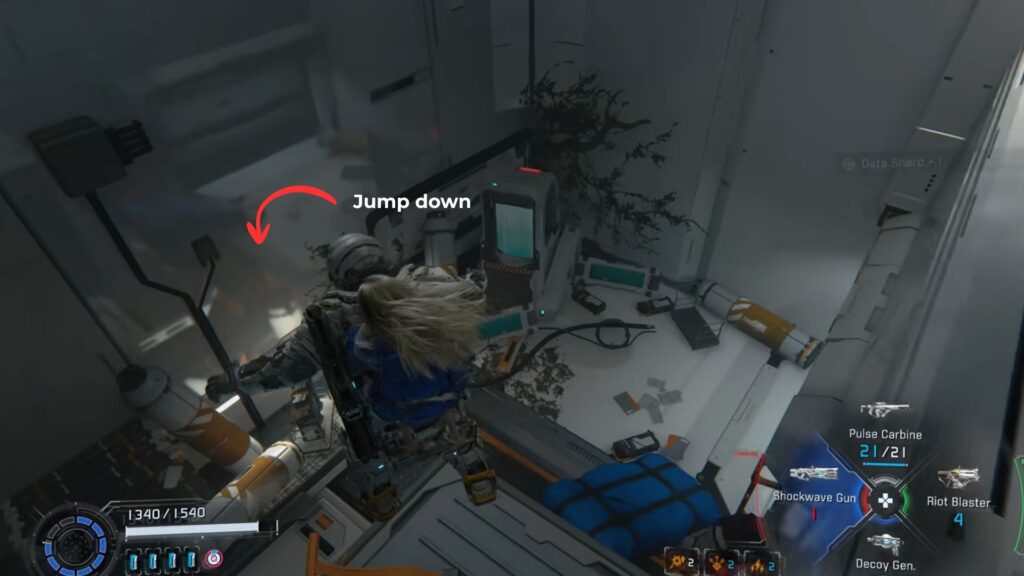Take the hand lift up when you’re ready. At the top, you’ll get a new weapon: the Pulse Carbine.