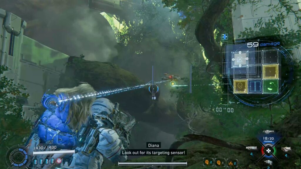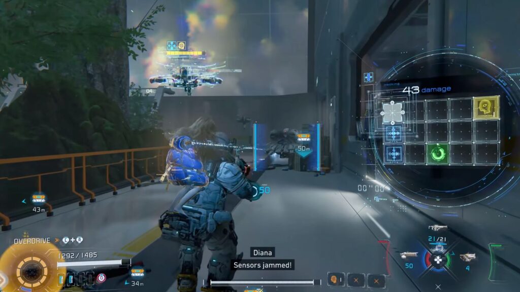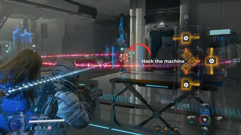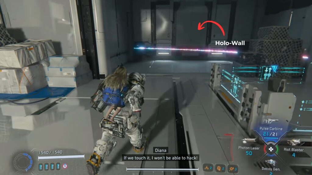 Re-enter the security area through the opposite door and drop to the lower floor. A two-wave enemy encounter is about to begin, and each wave brings its own jammer. Disabling the jammer quickly each time keeps Diana’s hacking online throughout the fight.