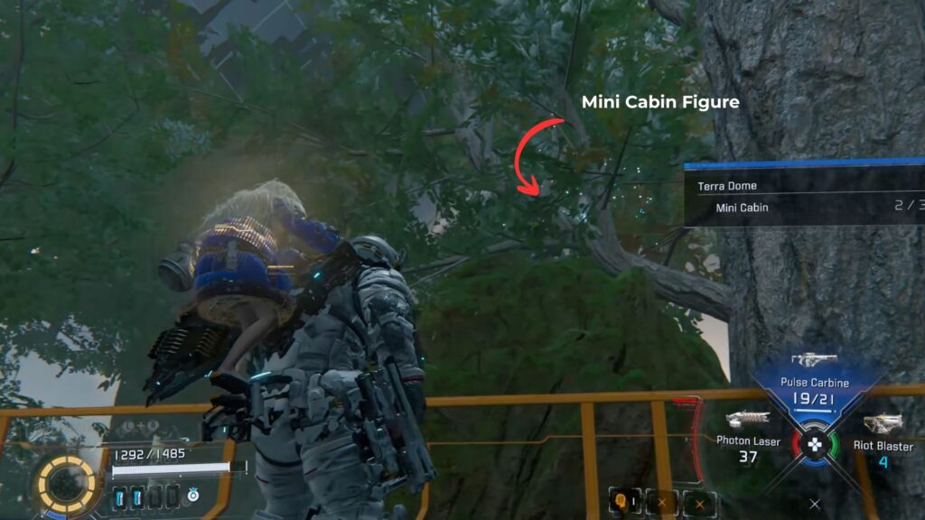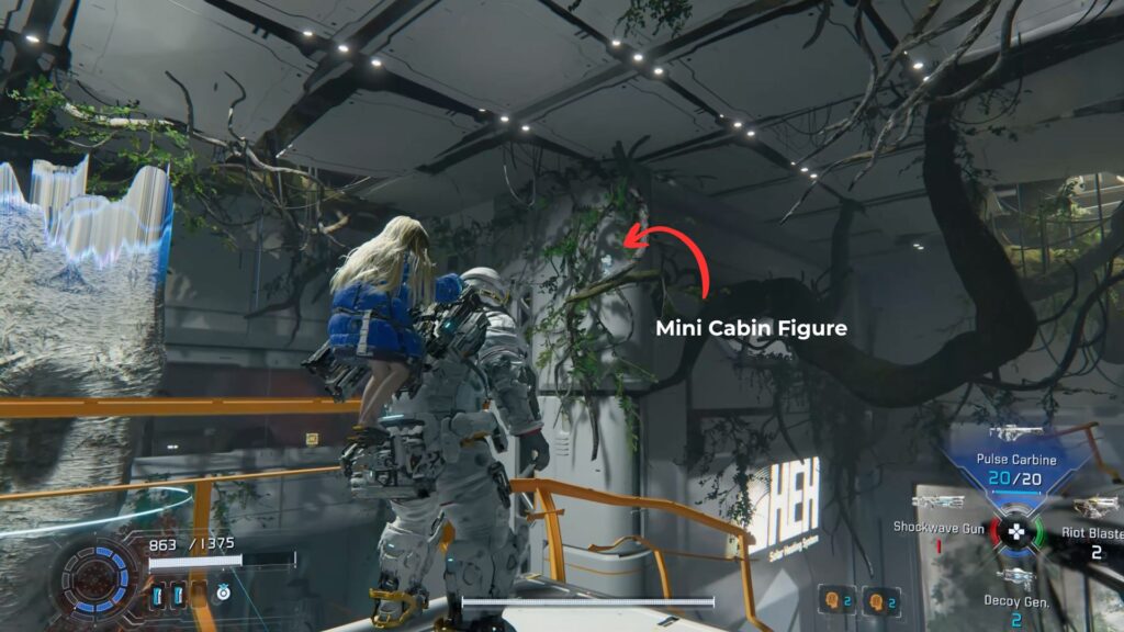 Now, you can turn around and look up near the ceiling. The Mini Cabin figure is perched on a branch or root high above. Shoot it down to claim it.