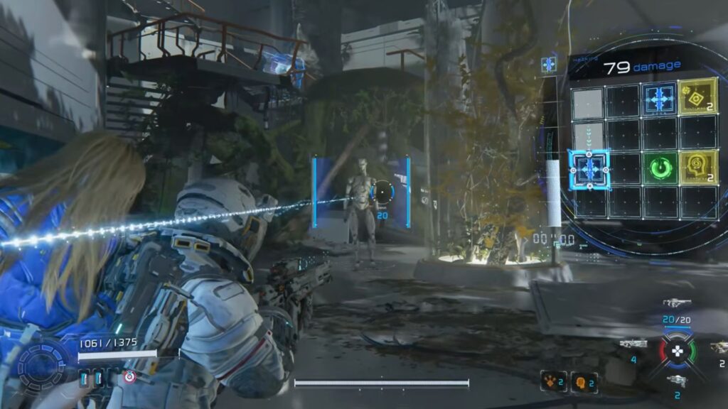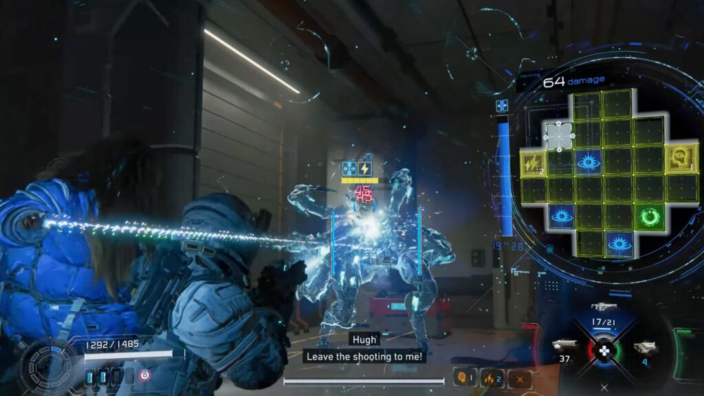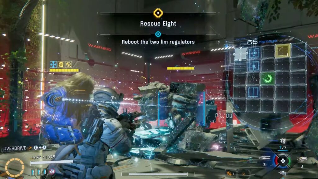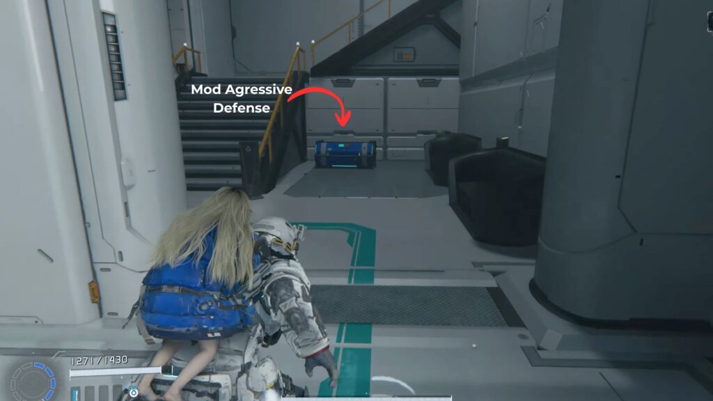 On the opposite side of the room, collect another Upgrade Component. Walk into the adjacent room to find Mod: Aggressive Defense, which reduces damage taken by 20% while aiming. Activate the Escape Hatch there as well.