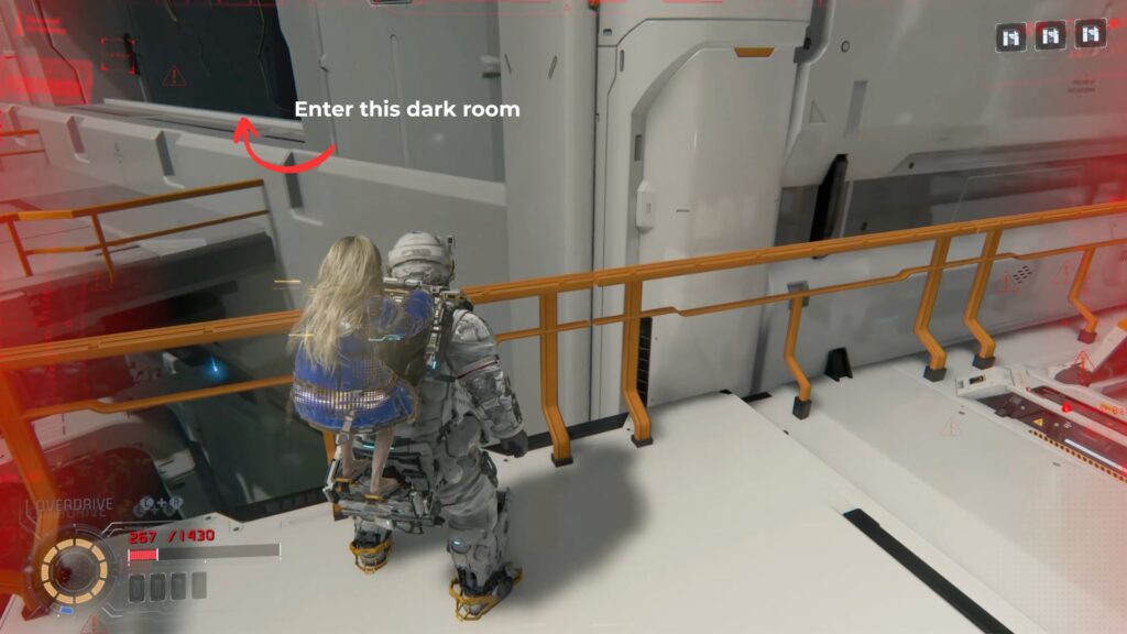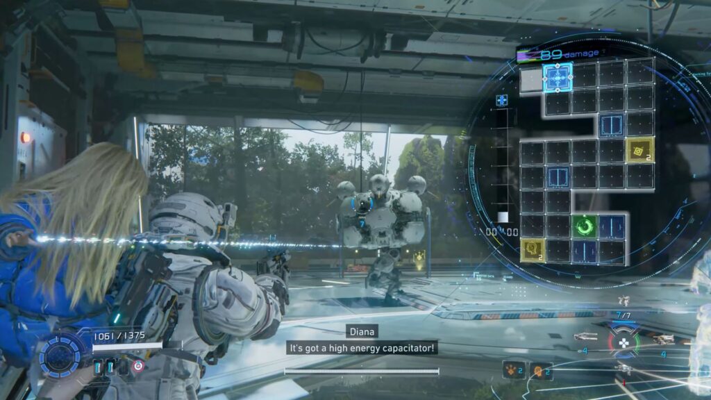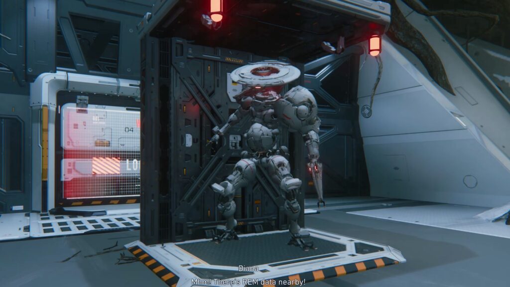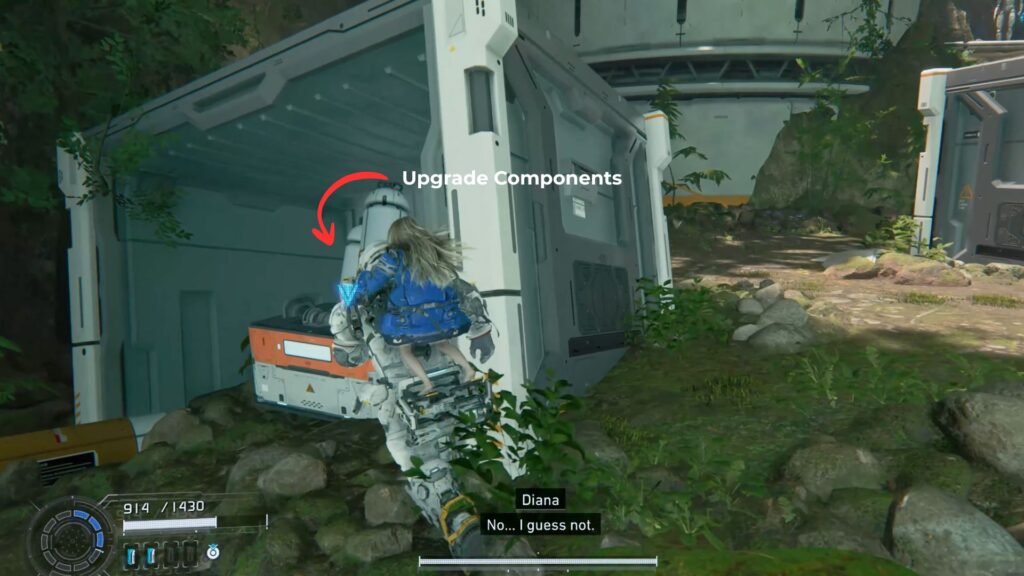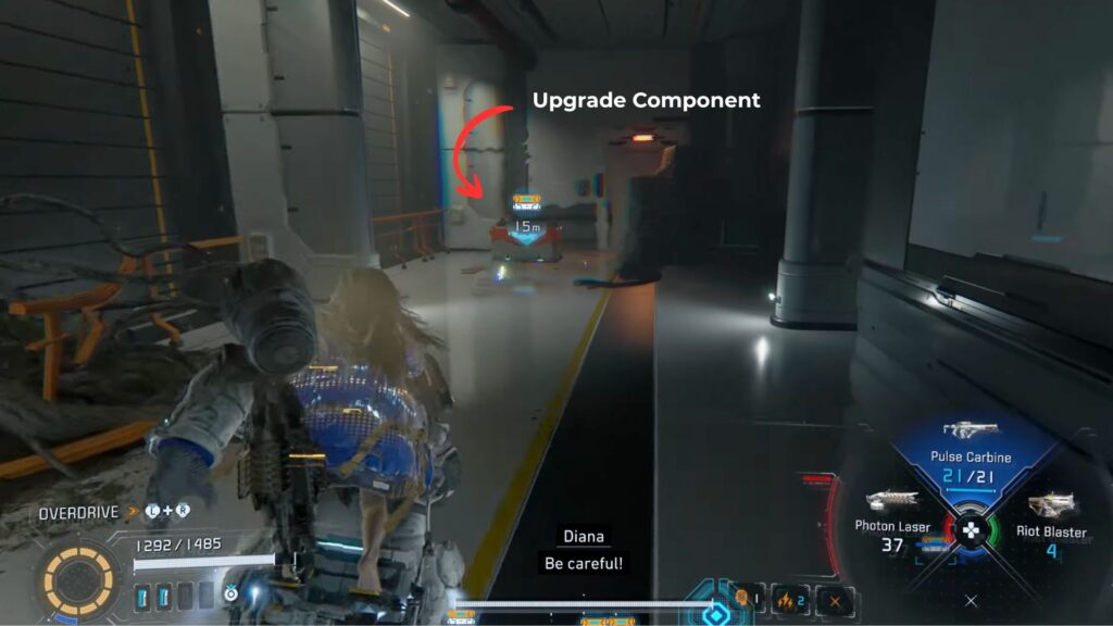 Diana will point out a Gen Chip visible below but you cannot reach it from here yet. Head up the stairs and check the first open room on the left for an Upgrade Component before looping back to the Escape Hatch area.