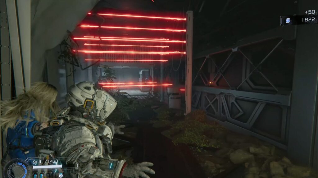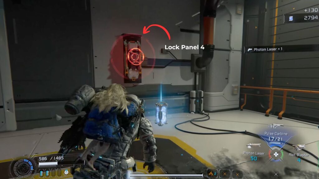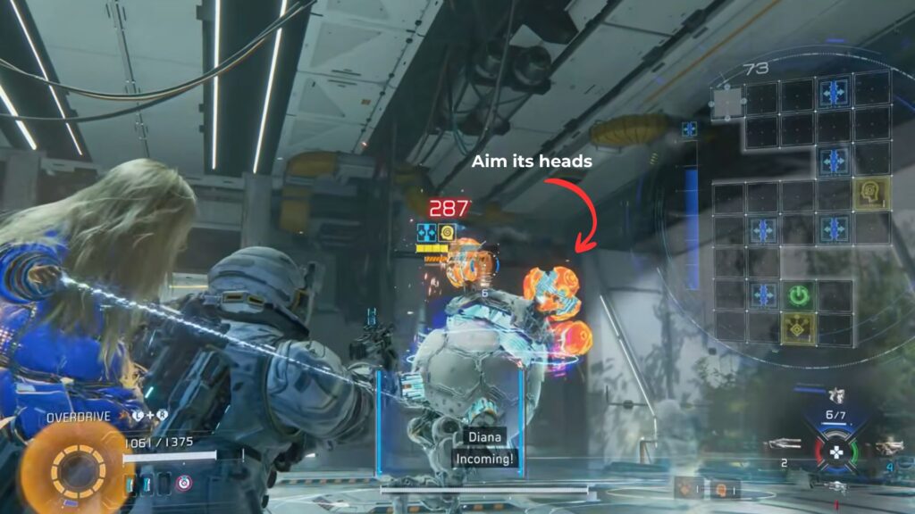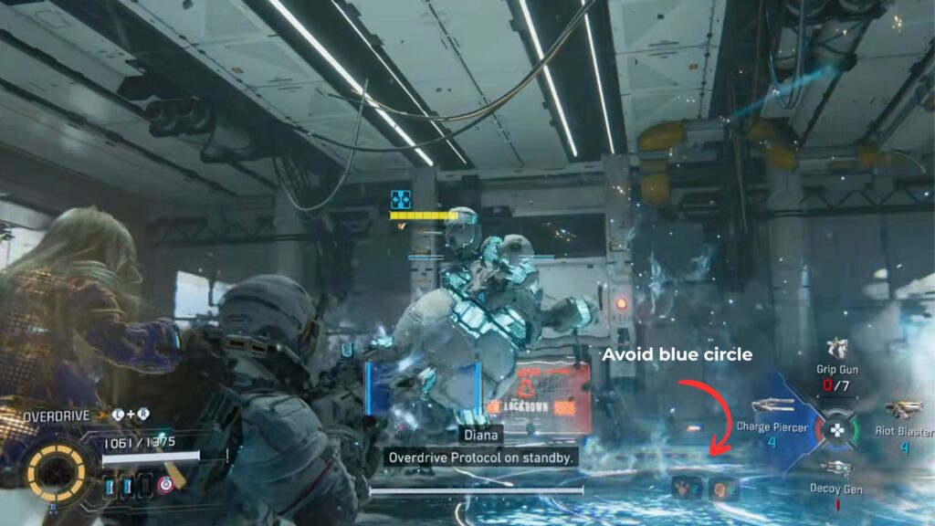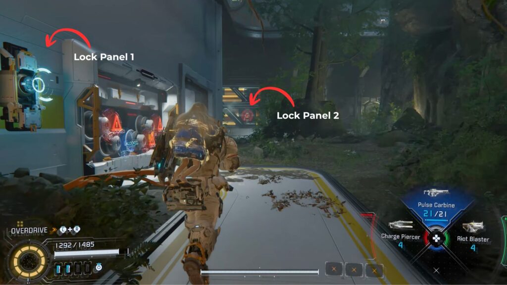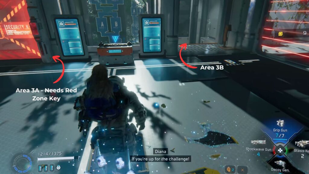 If you have the Red Gate Key, the entrance is to the right of the Escape Hatch. Inside, avoid the lasers on the lower floor and take the right path first. You’ll face a Lancer and a Watcher together. The Watcher’s lasers will target you during the fight, so listen for Diana’s warnings and dodge when she calls it out. After defeating them, more Lancers, Crushers, and an Impeder join. The lower laser floor becomes part of the arena, so be ready to move and jump while fighting.