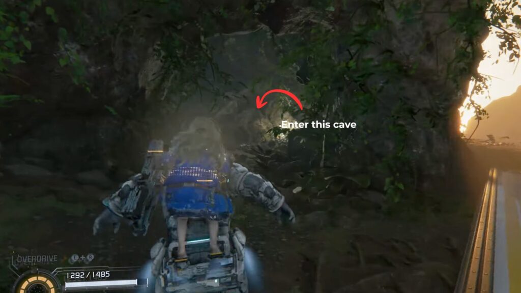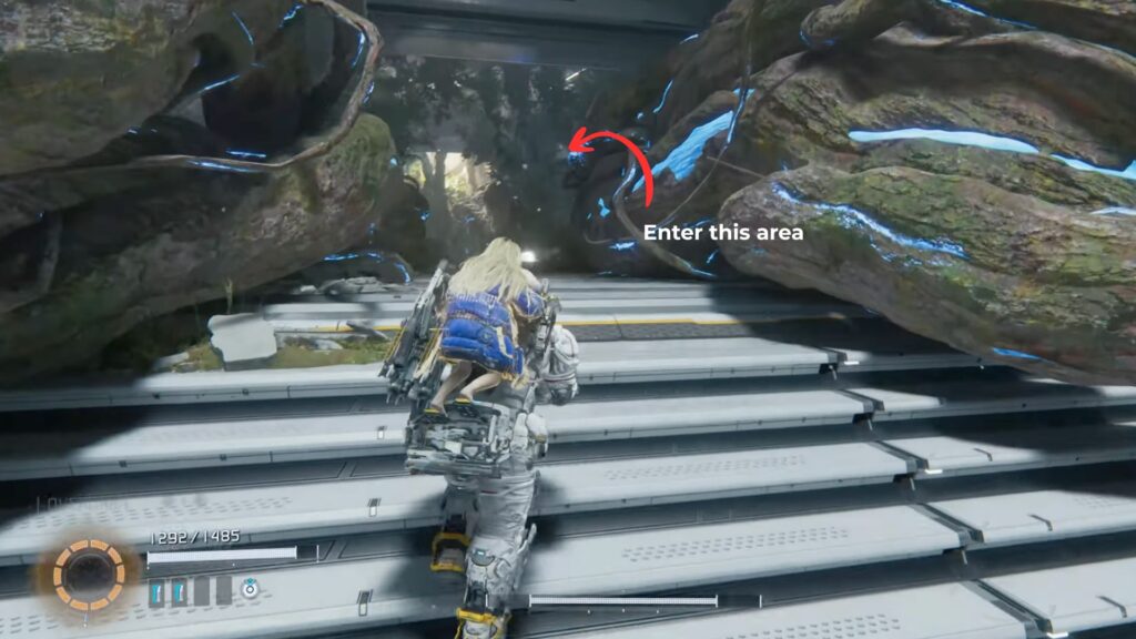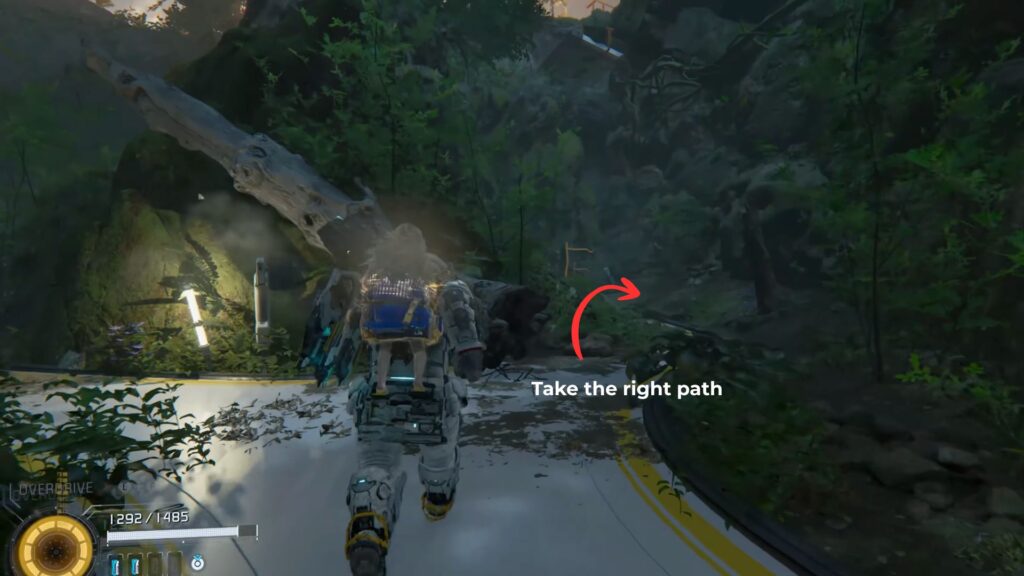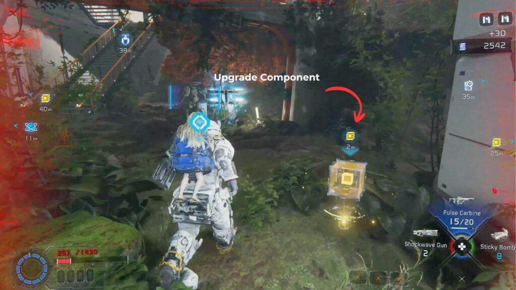 Now, move to the left side of the stairs and jump over the large roots to find another hidden Upgrade Component.