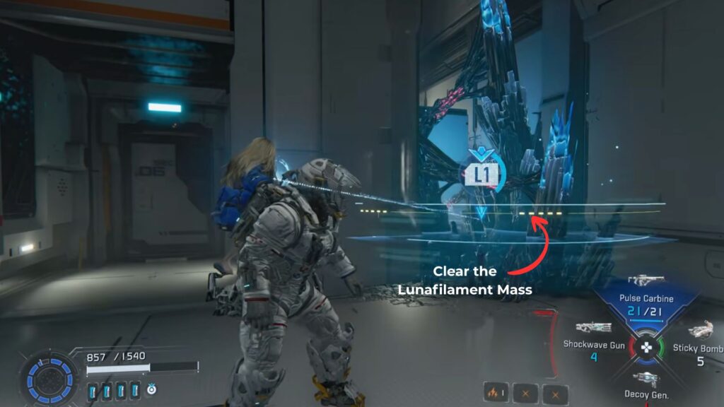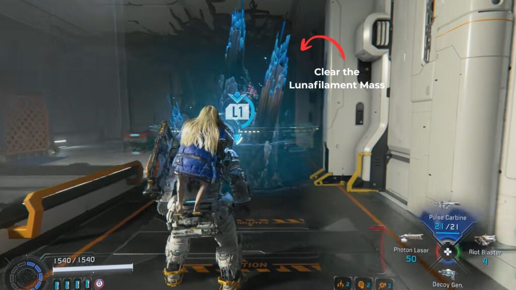 Inside the next room a yellow security barrier blocks the path forward. Before crossing it, check the wall beside the door you entered through. Lunafilament Mass are covering a climbable section. Clear it and then drop into the room at the far end. REM: Swing is waiting for you there.