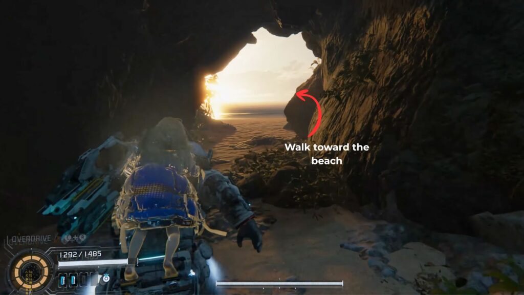 Follow the beach path forward. When you notice a large rock on your right , check it because it is hiding an Upgrade Component.