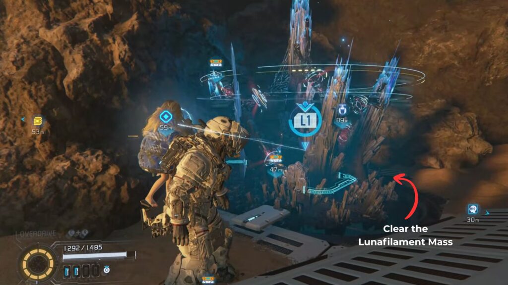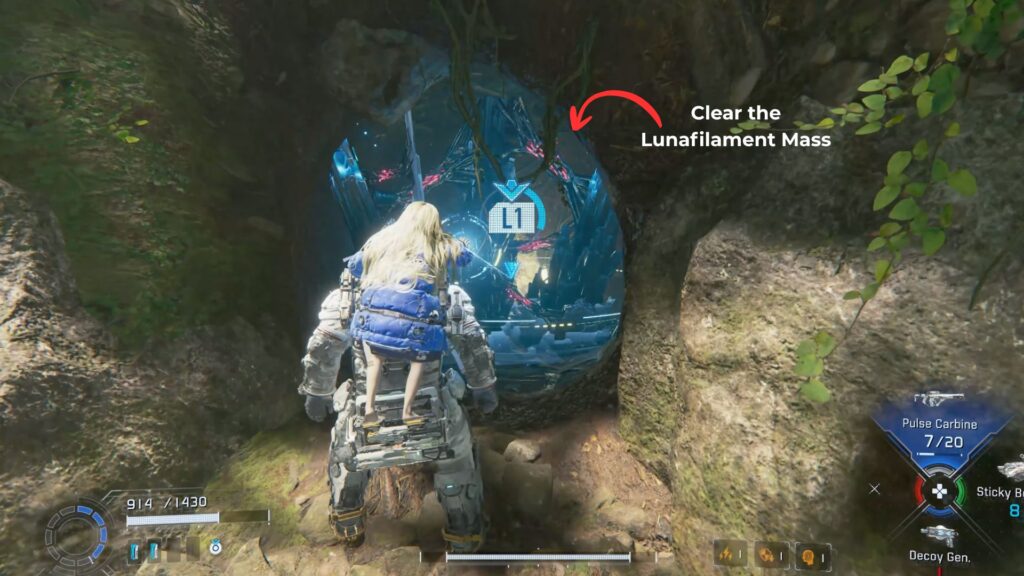 From here, look for a small cave in the wall above with a Walker guarding it. Defeat the Walker, then use the Lim Eraser to clear the Lunafilament Mass blocking the gap.