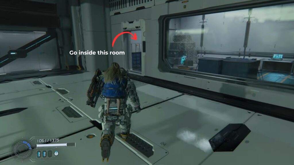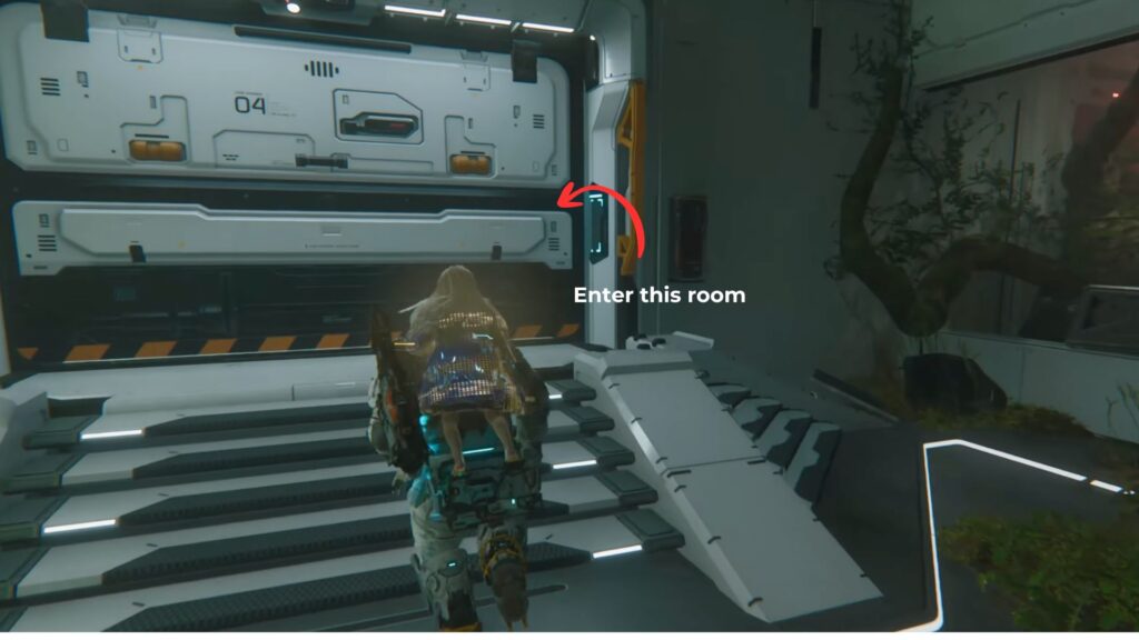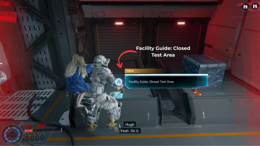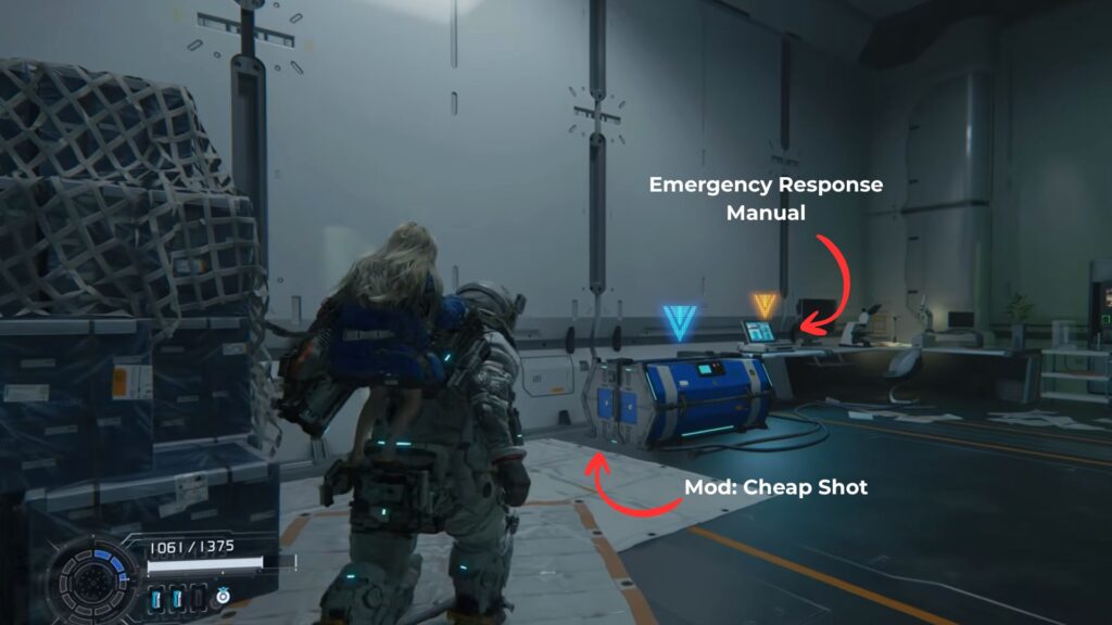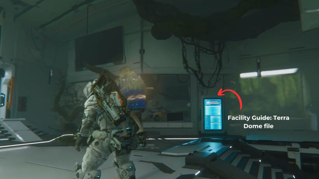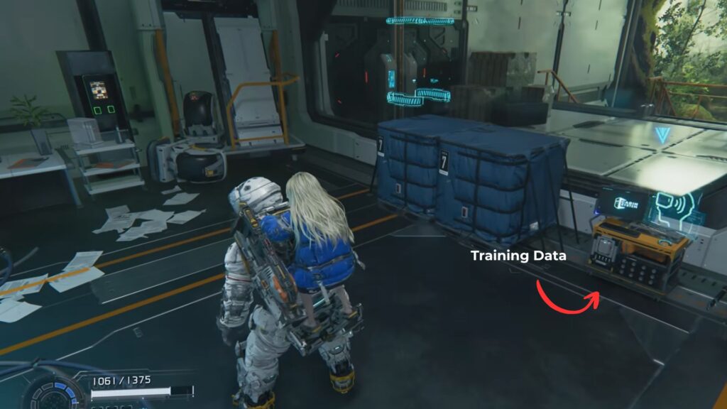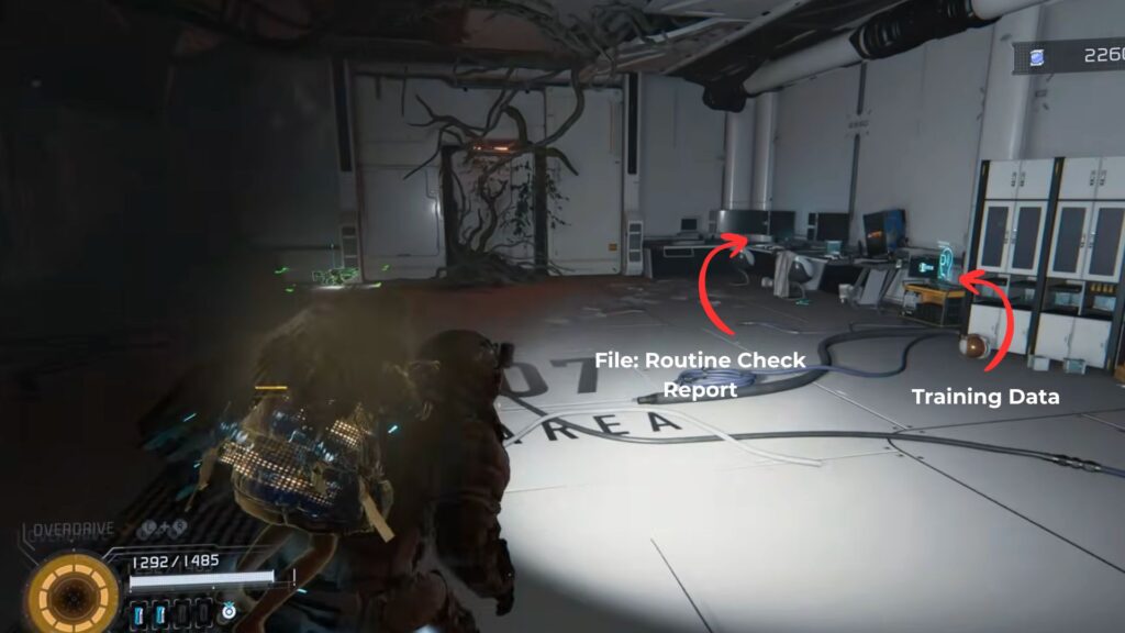 Ahead, there’s a room and a lift going up. Check the room first. Inside, interact with a broken Cabin unit to get Training Data, which unlocks more Training Simulations at the Shelter. Also check the desk on the left with the Emergency Response Manual file on the laptop.
