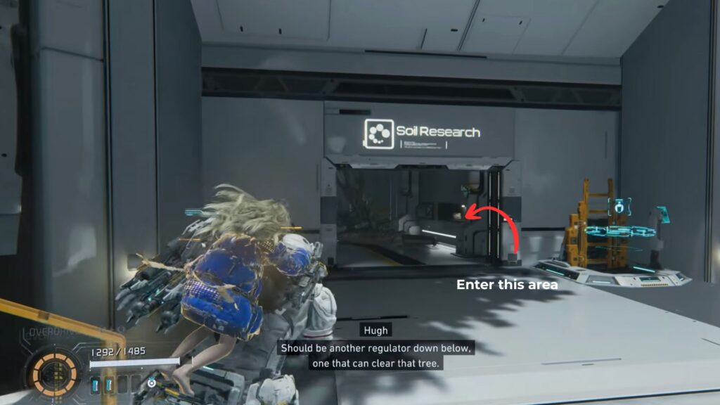 Turn back and head down the hallway. As you descend the stairs, the door on your left will now be open. Go through it to enter the next area: Soil Research.
