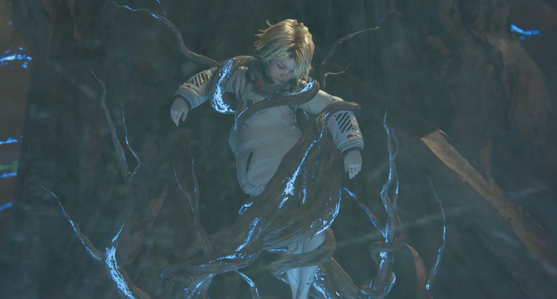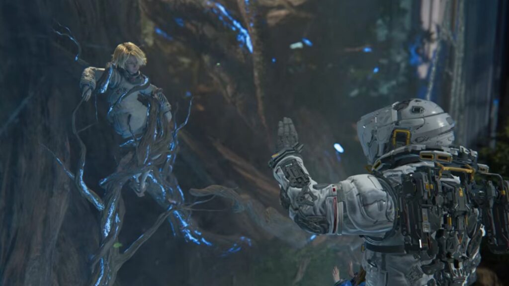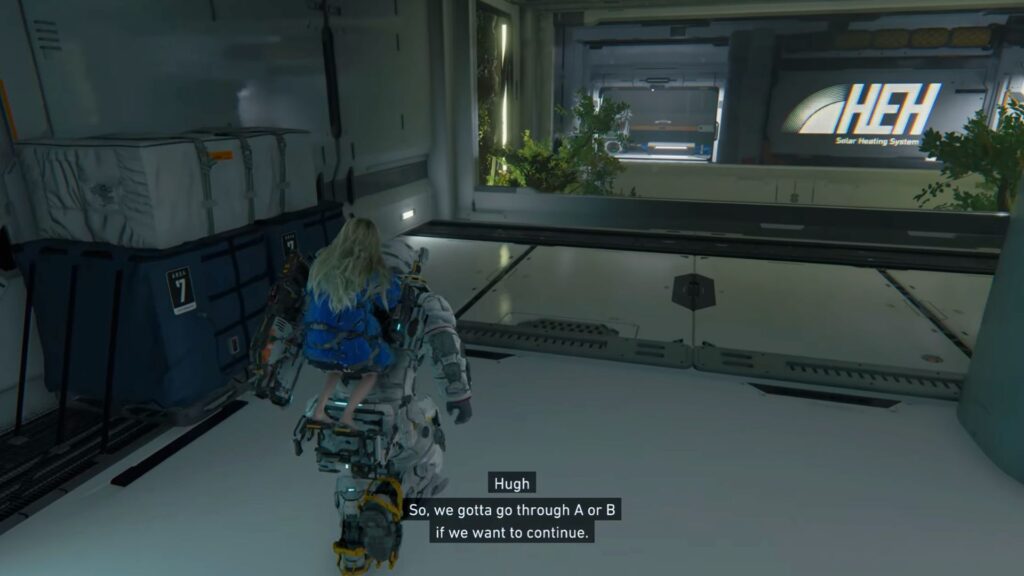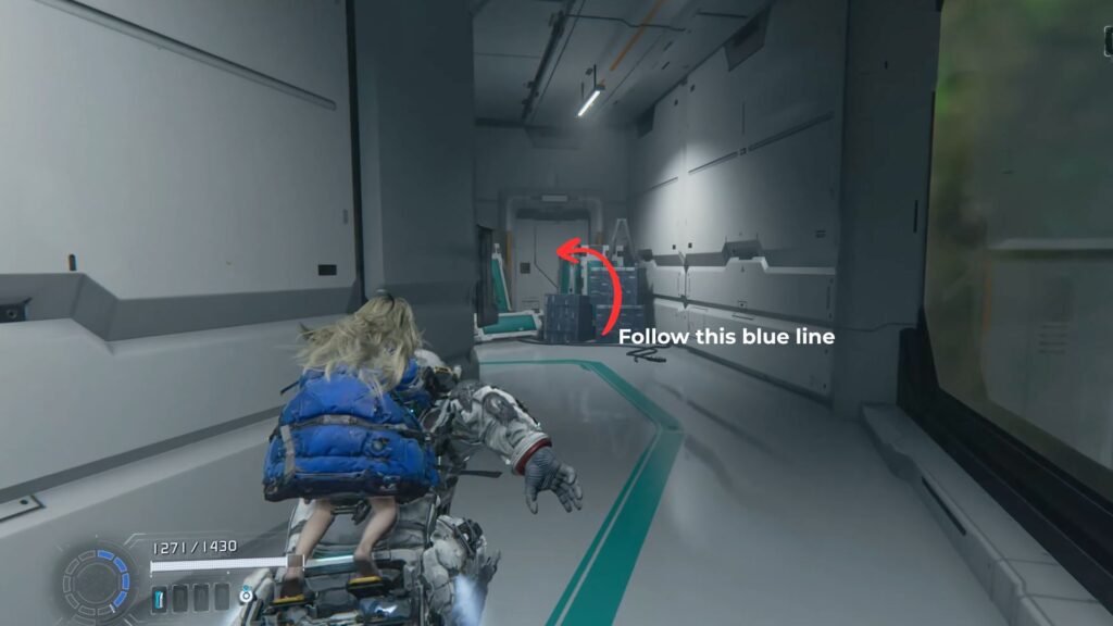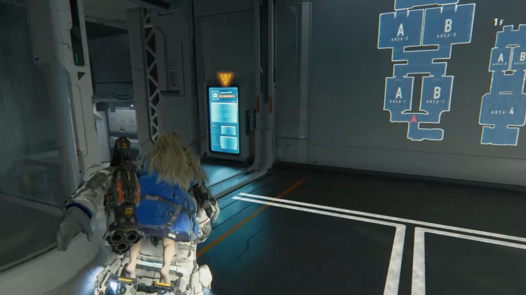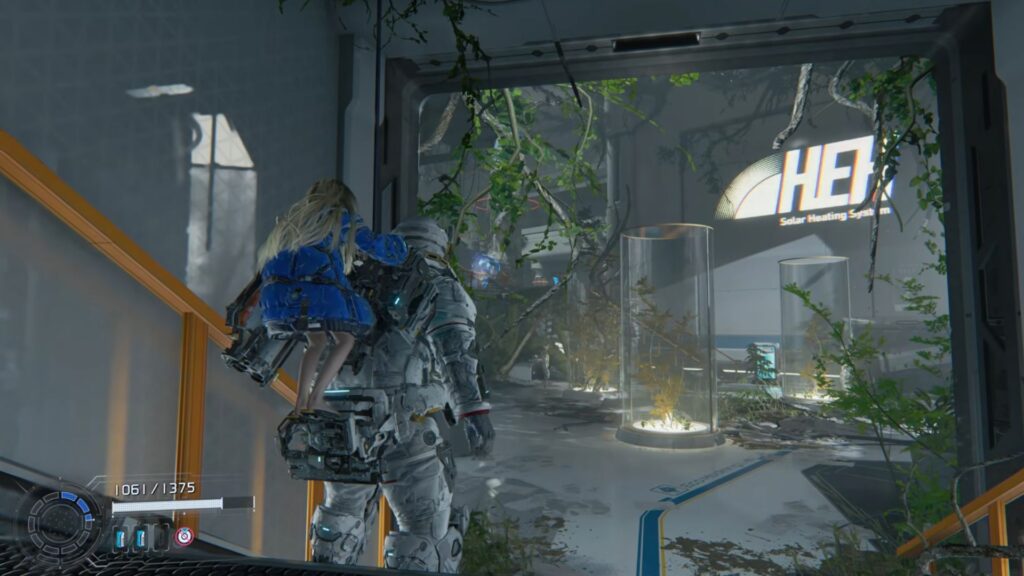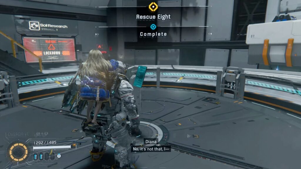 With everything collected, go up the stairs and follow the hallway all the way to the end to trigger a scene. After it finishes, you’ll unlock Another Pragmata: Meet the trapped girl trophy and receive a new objective, to find the Underground Lim Regulator.