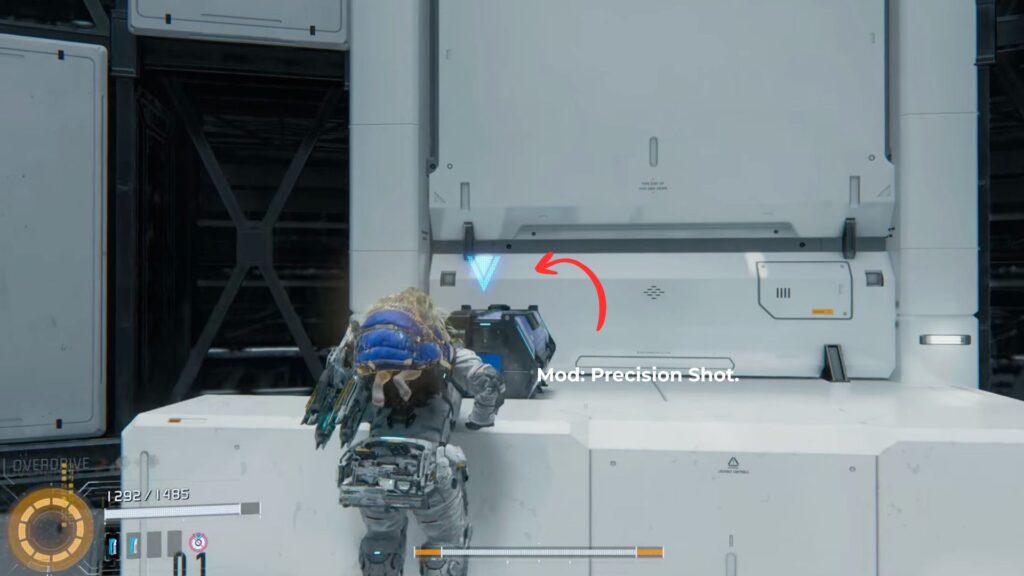 On the side of the lift opposite the stairs, you’ll spot a ledge you can jump across to. There’s a blue chest here containing Mod: Precision Shot.