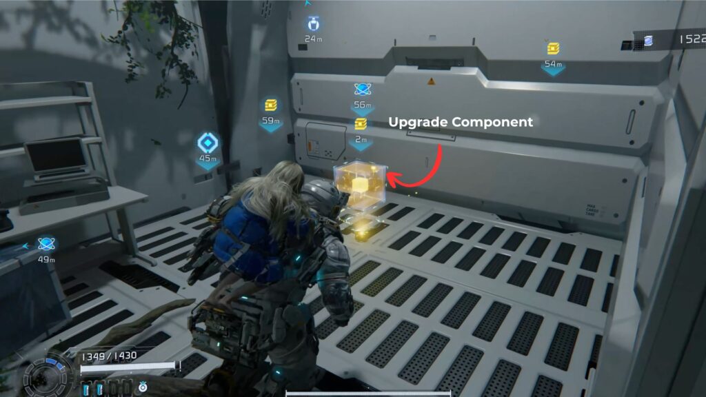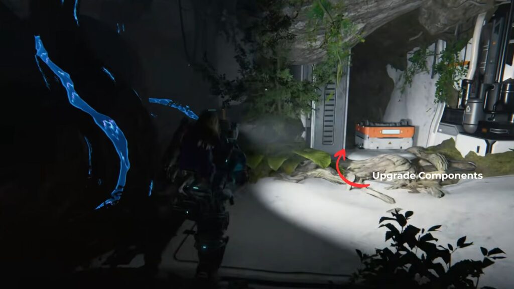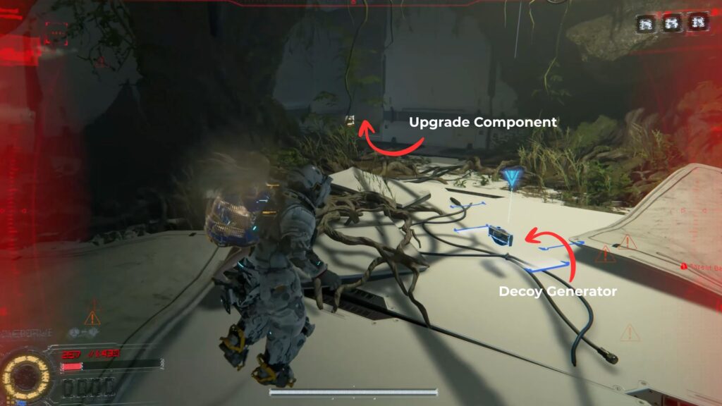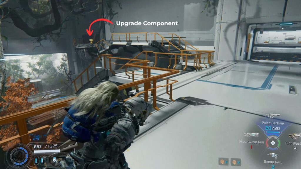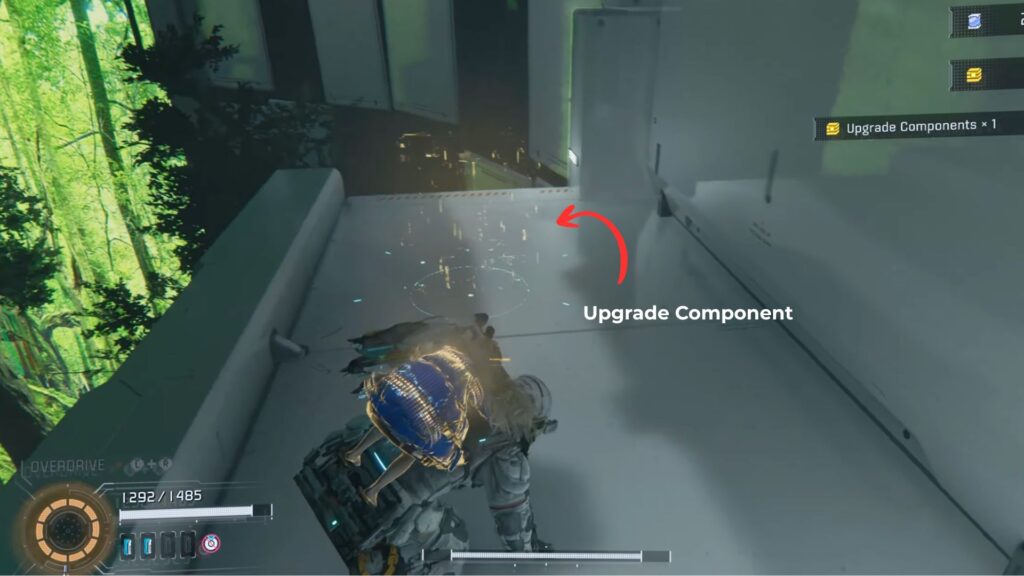 From the staircase area, look for a darkened room above a small platform to the left of the Escape Hatch. Jump and thrust across, then crawl through the window. The Upgrade Component is toward the back of the room. There’s also a Decoy Generator near the tree inside if you want it.