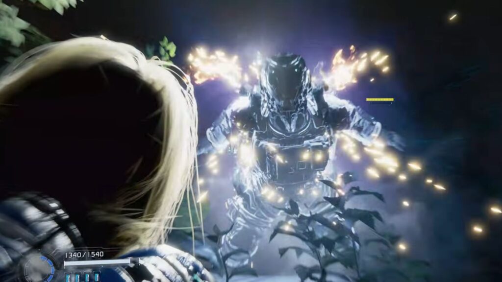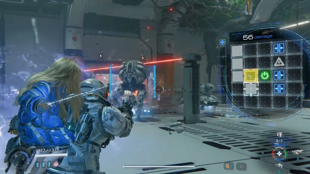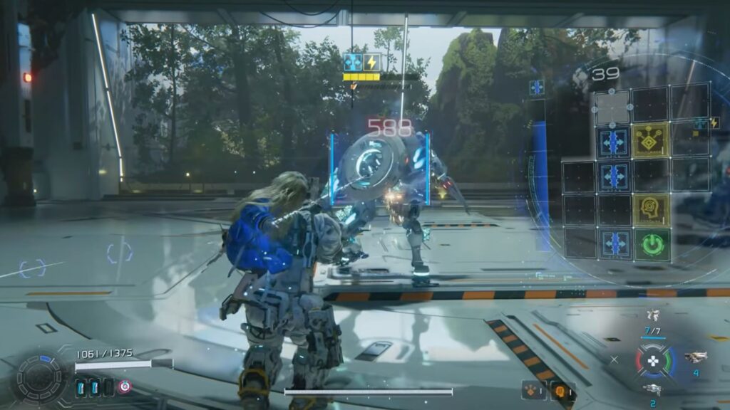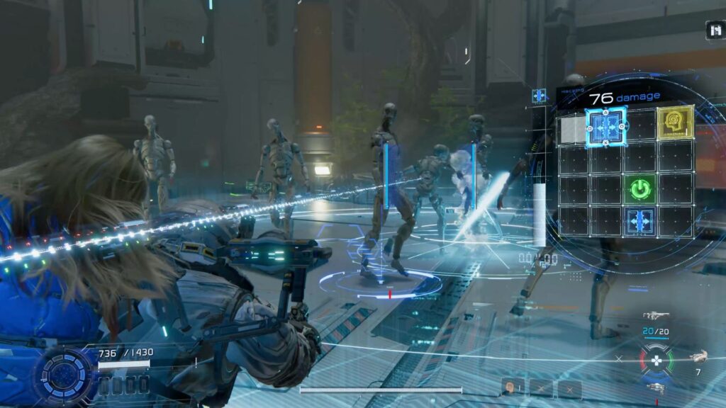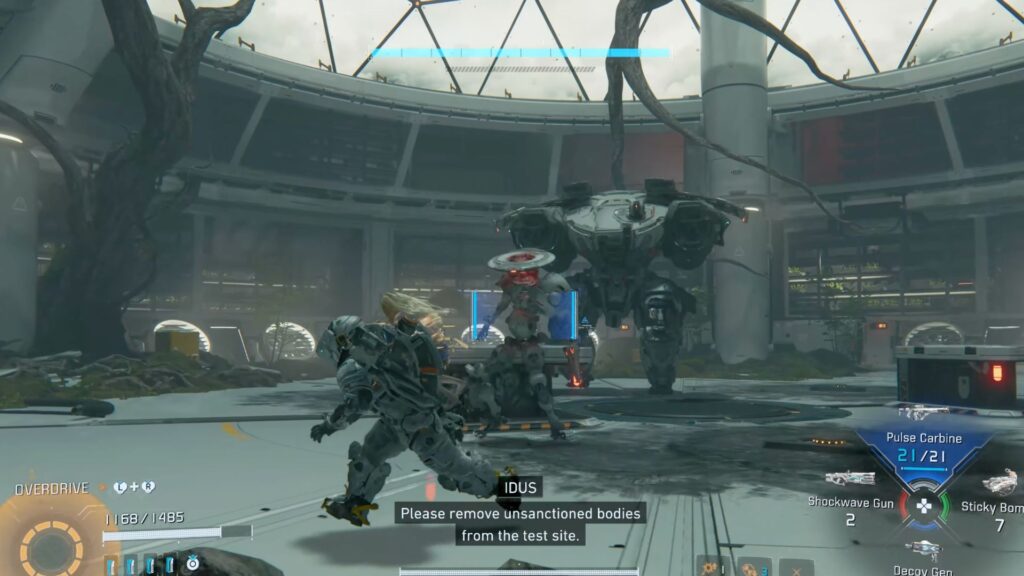 Inside, IDUS wakes up a Sector Guard, the same boss type from Sector 01, accompanied by two Lancers. Take the Lancers down first, as their mid-range attacks make dodging the Sector Guard’s missile barrages much harder. Once they’re gone, focus on hacking the Sector Guard and targeting its back.
