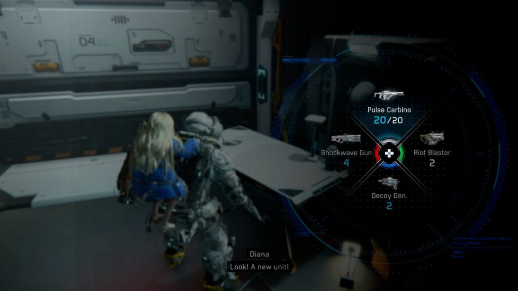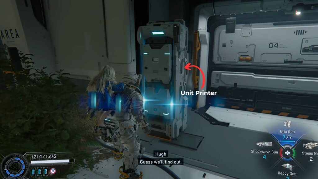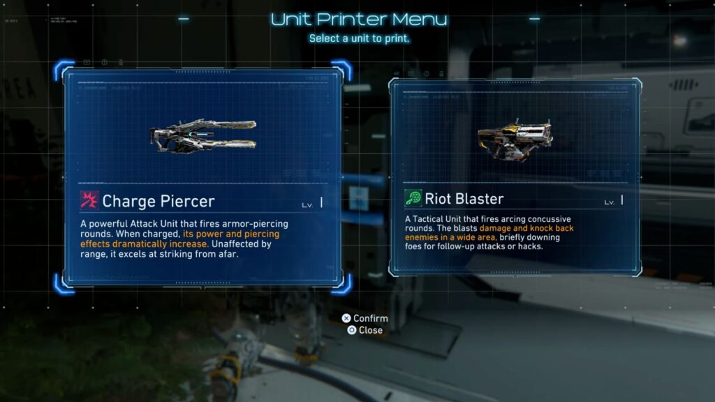 You may also come across a Unit Printer in this area. Activating it lets you choose between a Charge Piercer Attack Unit and a Riot Blaster Tactical Unit to add to your loadout. Once you choose, it shuts down and can’t be used again.