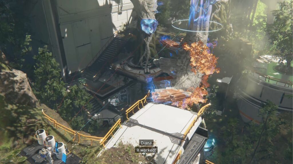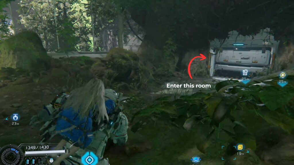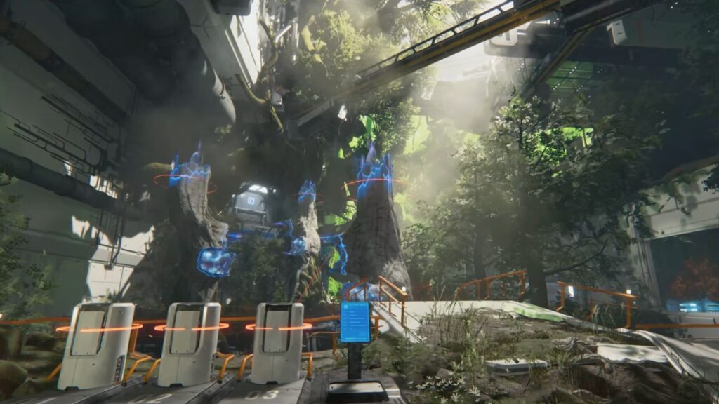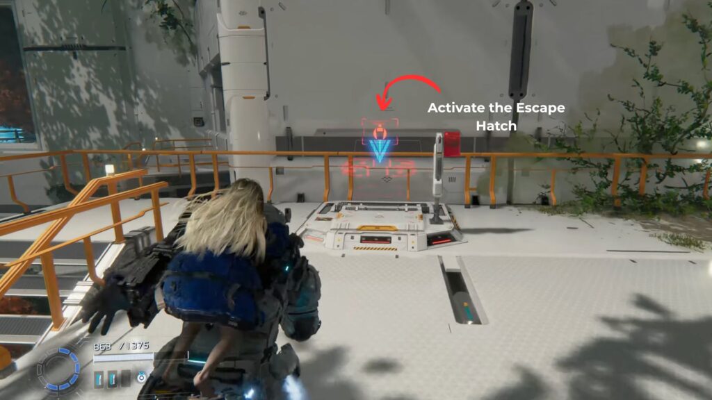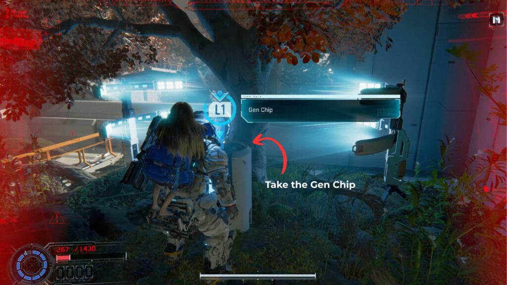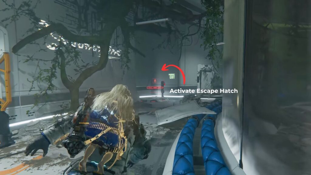 Follow the blue line on the floor to a large door. Inside are three trees missing branches. You need three Gen Chips to fix them and open the path. Before looking for them, go up the stairs near the generators, turn right, and activate the Escape Hatch.