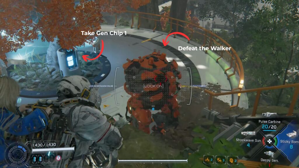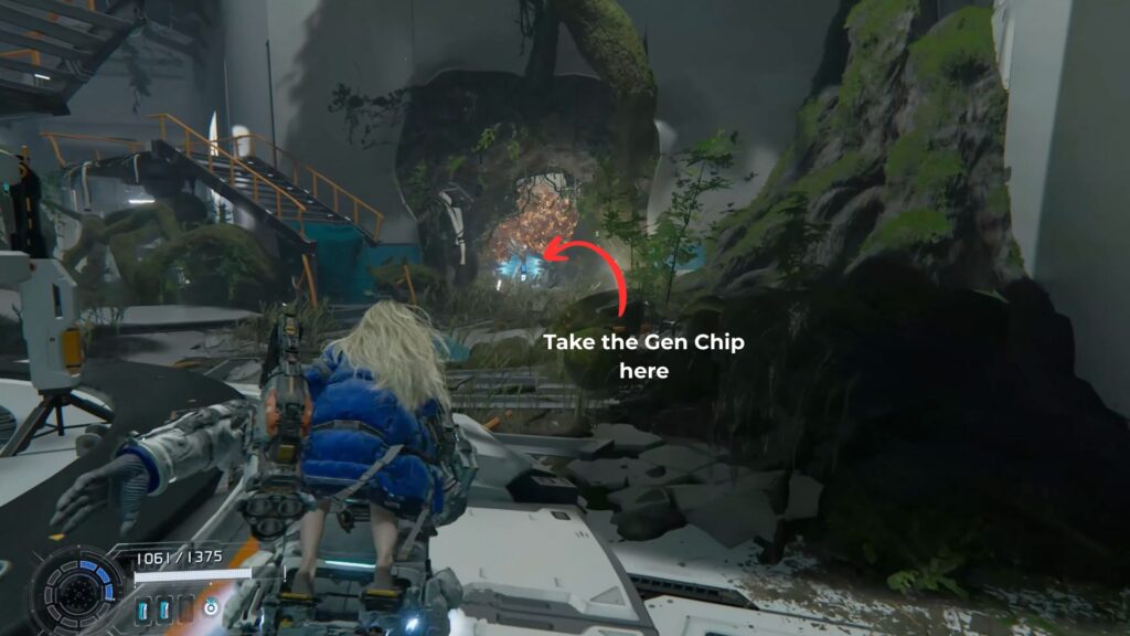 Take out the Crusher MK-II near the top of the stairs and continue to the Gen Chip device to collect Gen Chip 1.