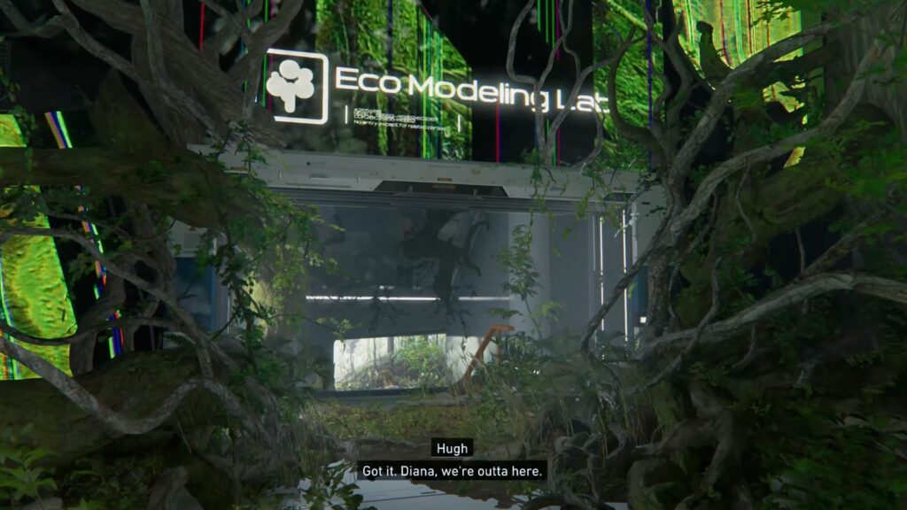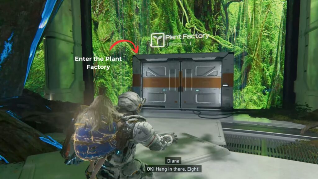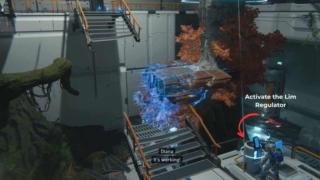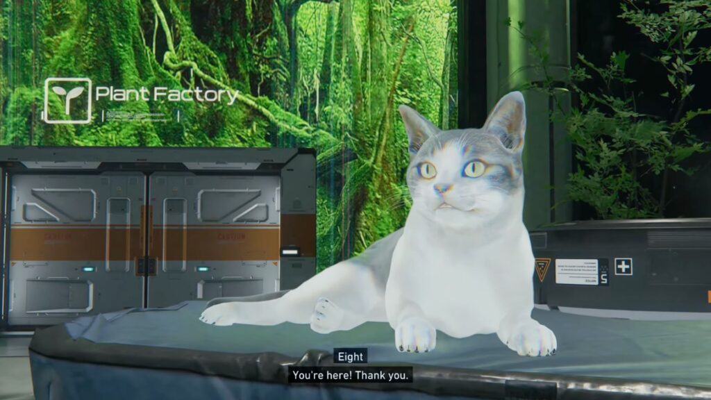 Eight contacts you again, this time as a cat. Her real body is somewhere above, but the central lift is blocked by plants. To clear it, you need to reboot two Lim Regulators in the Plant Factory and the Eco Modeling Lab.