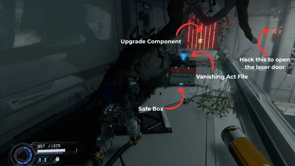 Inside is a Safe Box with 300 Lunafilament, a tablet containing the Vanishing Act information file, and an Upgrade Component locked behind lasers. You need to leave the room first, and hack the terminal on the wall outside to deactivate the grid and grab it.
