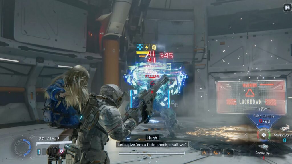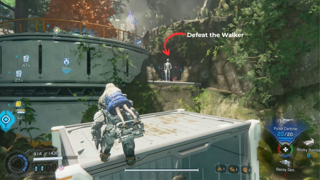 Drop to the lower area when ready. Six Walkers will swarm you. Use the Decoy Generator or Stasis Net to manage the crowd and keep luring enemies into the lightning circles. A Bomber follows after the Walkers. Apply the same strategy to limit its explosive attacks.