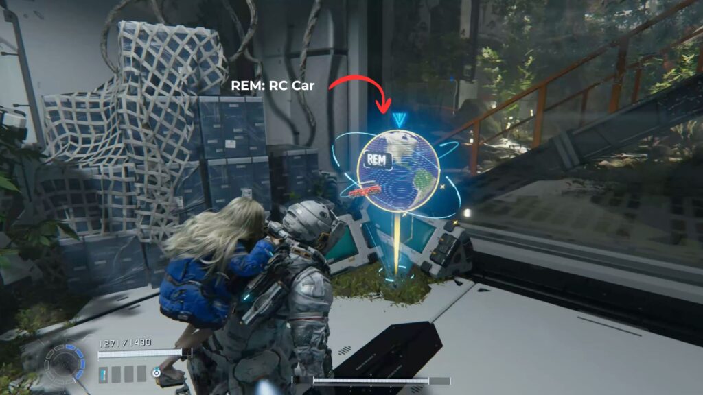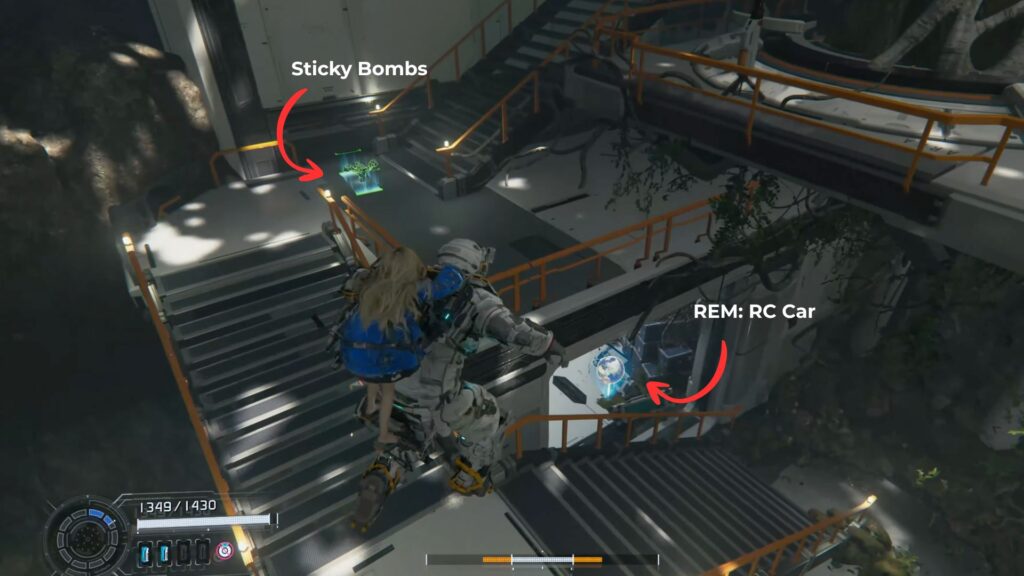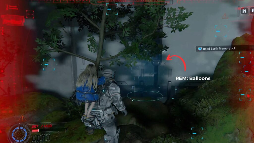 Back through the central area, you’ll find an Upgrade Component just after stepping out. Across from it, past a small tree, a Walker guards another REM. Defeat it and collect the Balloons REM.