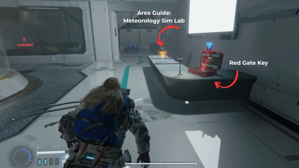 Next, follow the blue paint line on the floor into the lab built into the wall ahead. Inside the lab, a Red Gate Key is sitting on a desk alongside a tablet with the Area Guide: Meteorology Sim Lab information file.