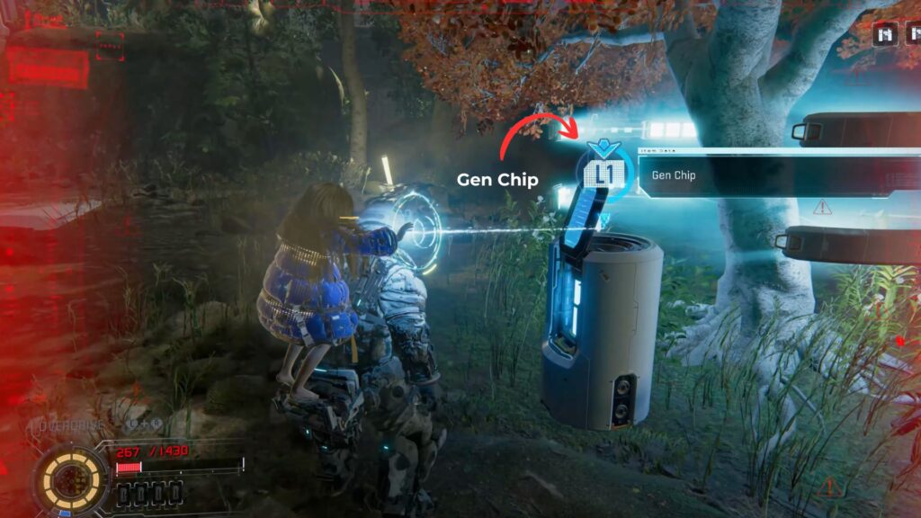The gap ahead is too wide to cross, so you need a Gen Chip. Drop down near the large tree and find a hole in the wall by some broken stairs. Go inside, defeat the Impeder, and interact with the small tree to take the Gen Chip.