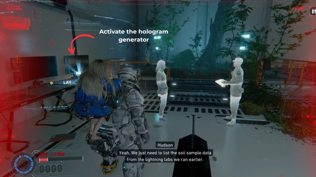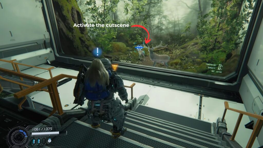 After the fight, go into the next room with holographic deer. Activate the blue circle in front of the display to trigger a short conversation.