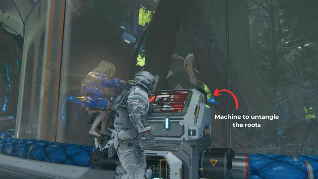Move into the next room and use the device at the far end to clear the tangled roots in the center. IDUS will stop the process early, so you’ll need another way.