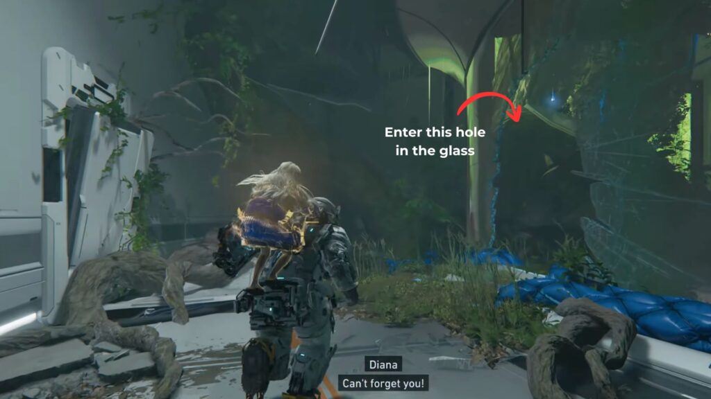 Follow the path to an Escape Hatch and activate it to unlock fast travel back to the Shelter. Near the glass wall, find a gap and go through it.